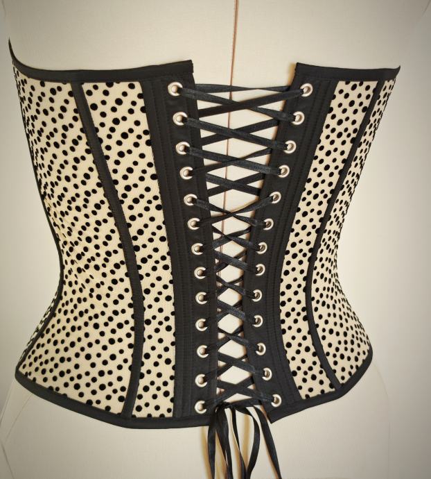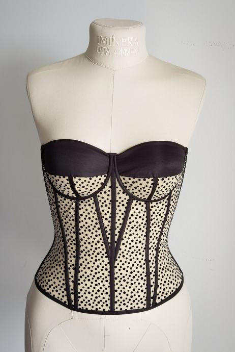 Korzet od elastične tkanine ima ugrađene prsne umetke (košarice) sa žicama. Izvrsno se slaže s različitim dugim ili kratkim suknjama, a možete ga kombinirati i s hlačama i sakom.