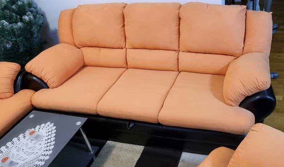 Garnitura - fotelja + dvosjed + trosjed,, nikad korištena. Kombinacija mikrofibre i imitacije kože. Ispod dvosjeda je kutija za odlaganje, a ispod trosjeda krevet na izvlačenje. Širina fotelje je 110 cm, dvosjeda 165 cm, a trosjeda 210 cm, a visina svih elemenata ‚100 cm. Cijena svih elemenata zajedno iznosi 1.500 EUR.