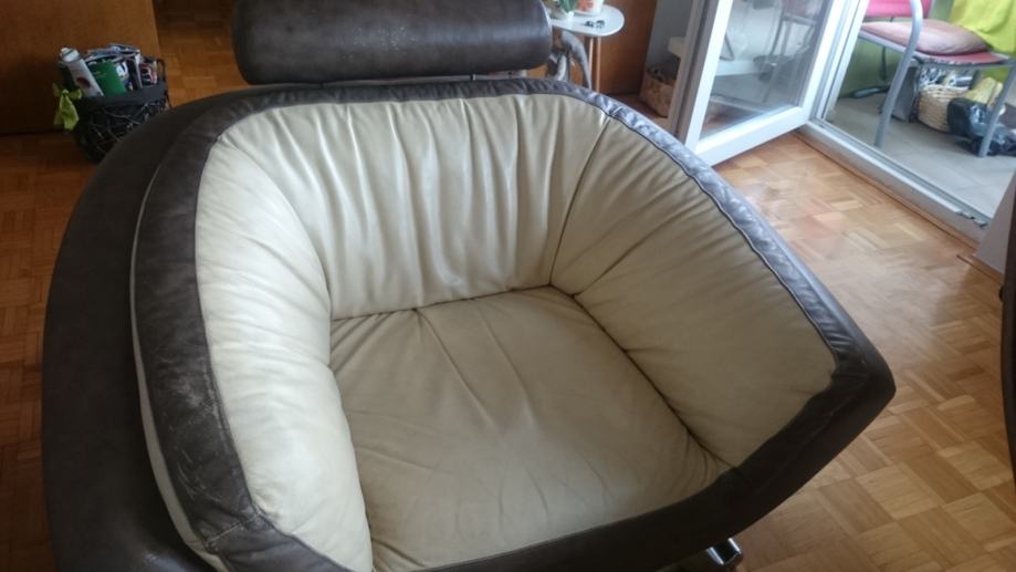 Kožna fotelja dvobojni( vanjska je boje duhana,unutarnja,bež boje)Pomični naslon za glavu glavu.
