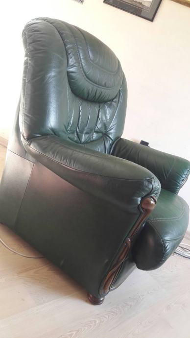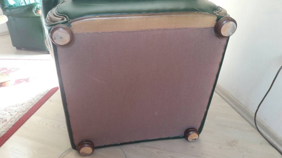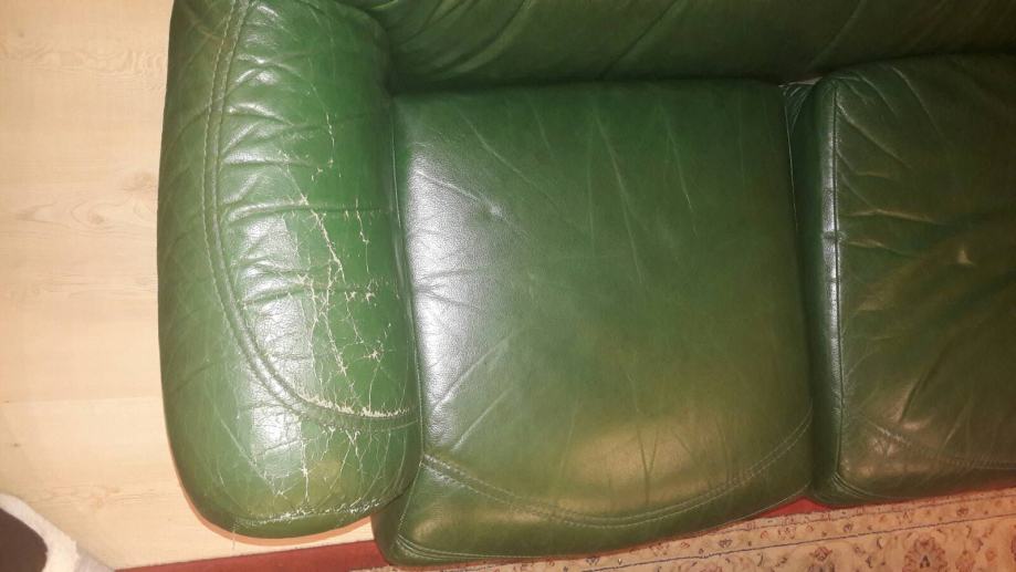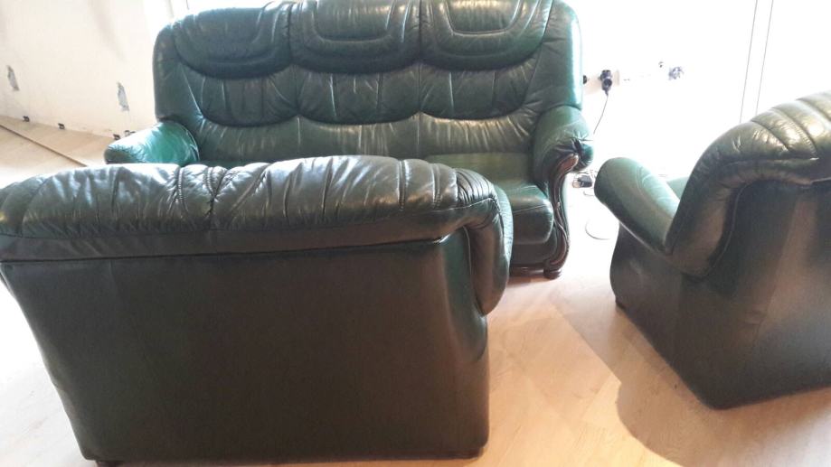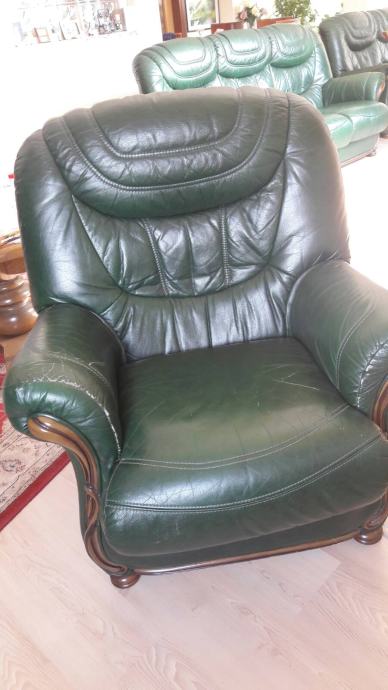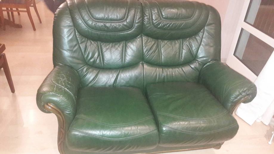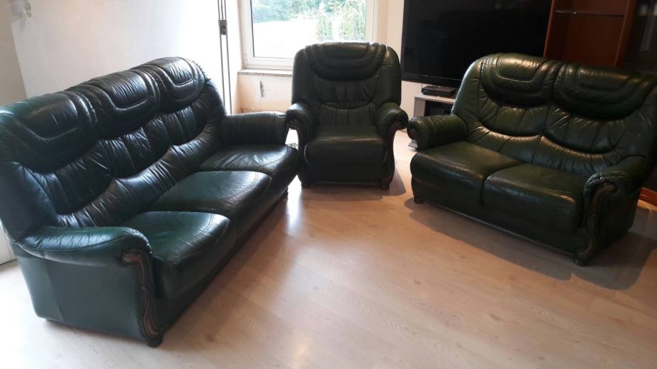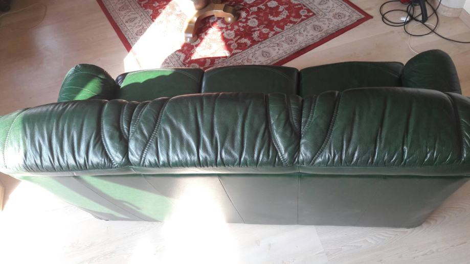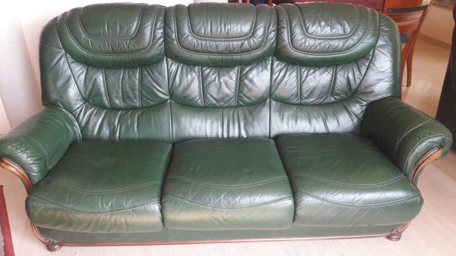 SNIZENO prodajemo maženu i paženu vrlo kvalitetnu smaragdno zelenu kožnu garnituru prekrasnog dizajna (trosjed, dvosjed i fotelju). Talijanska proizvodnja, puno drvo. Kvaliteta je vrhunska, jastuci su jednako čvrsti kao i prvog dana, nisu nigdje utonuli, bočni nasloni također ugodni za naslanjanje. Jako udobna za sjedenje, nije tvrda niti neugodna i za višesatno sjedenje. :-)