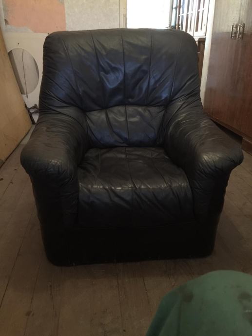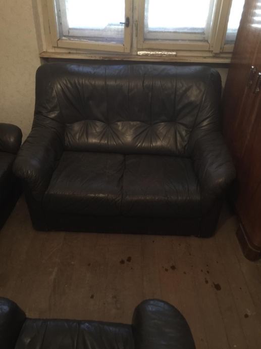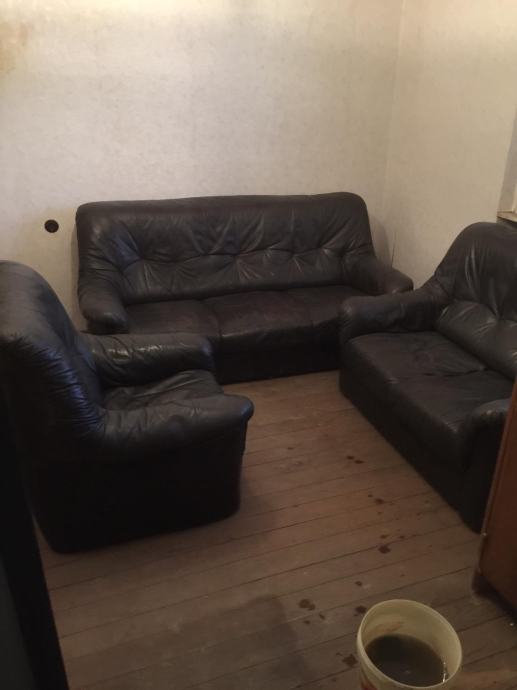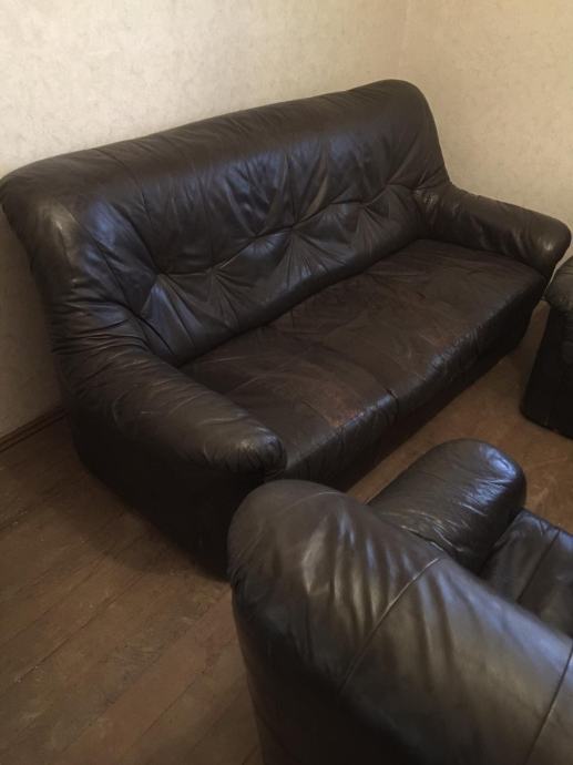 Kozna garnitura (trosjed,dvosjed, fotelja) tamno smede boje u dobrom stanju. mjere :trosjed 200x90 cm,dvosjed : 140x90 cm i fotelja : 90x90 cm