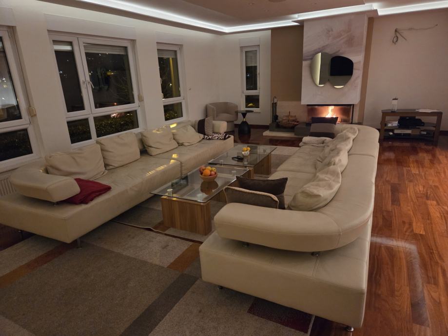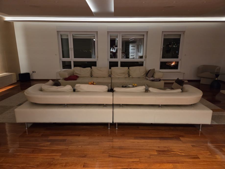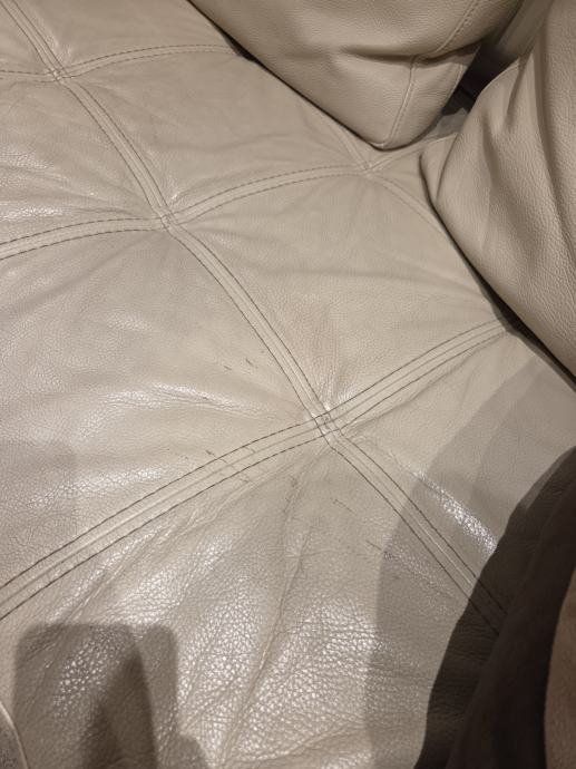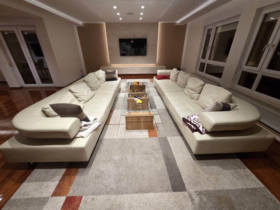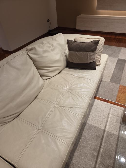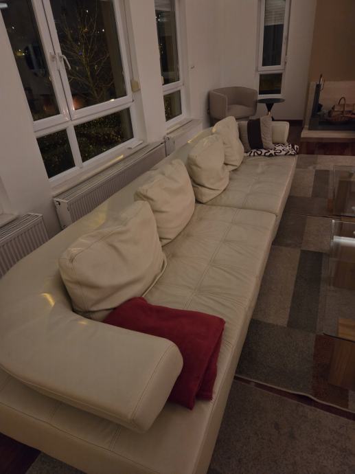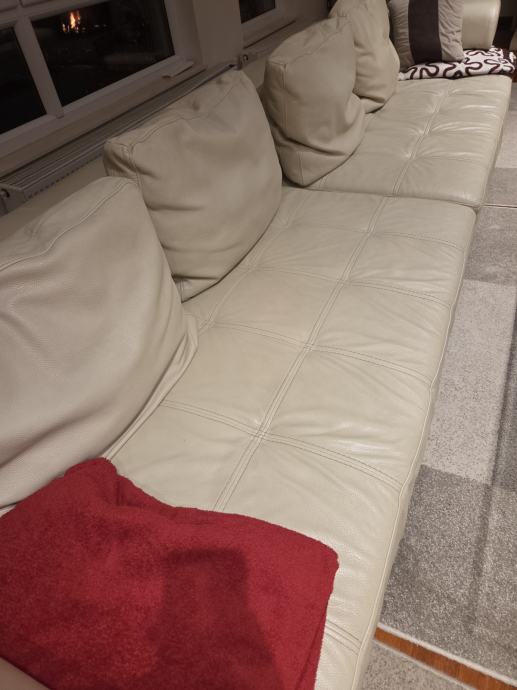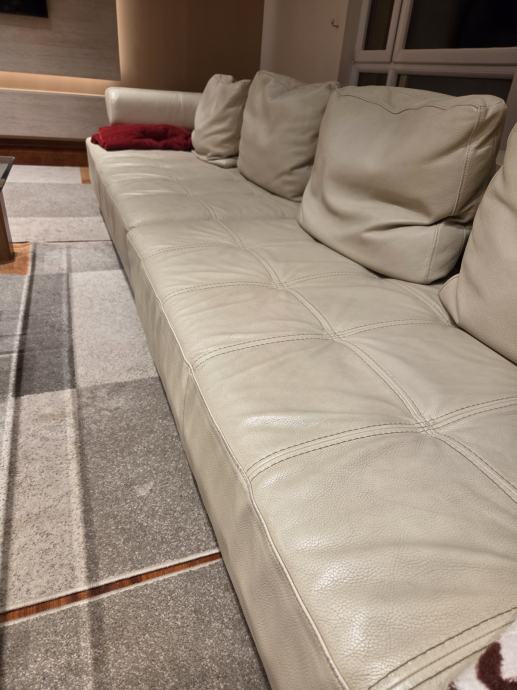 Kvalitetan veliki peterosjed od prave kože bež boje, privlačnog izgleda i lakog za održavanje. Savršen je za upotpunit veliki prostor. Širina je 364 cm, visina sjedišta 40 cm i dubina 105 cm. Podijeljen je na dva dijela koja se spoje na sredini tako da se mogu lako prenesti. Uz peterosjede dobiju se po svakom 4 velika jastuka koja su u kompletu sa sjedištem.