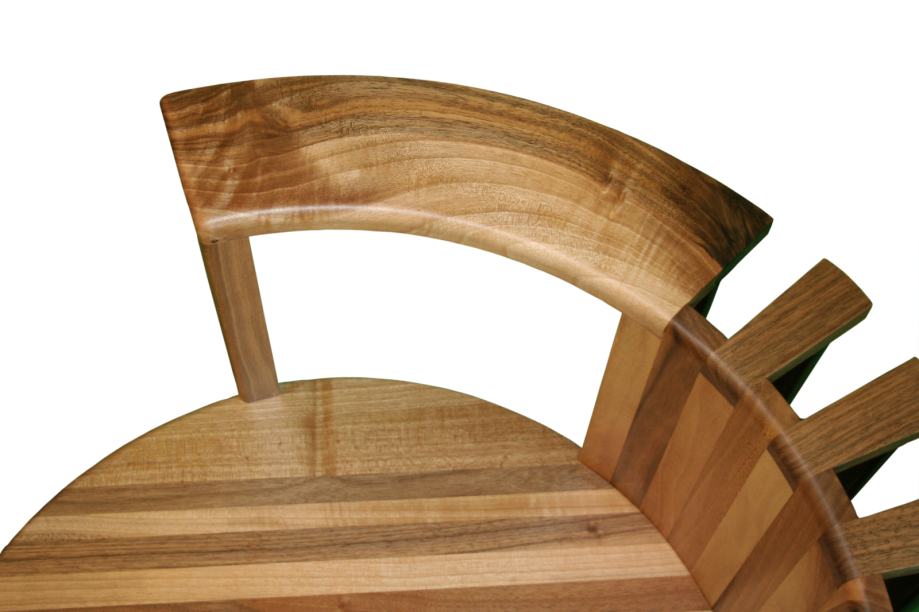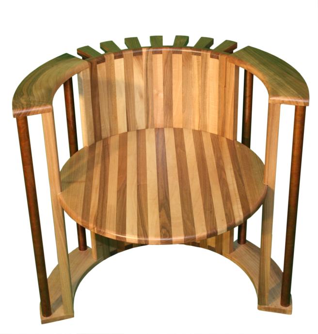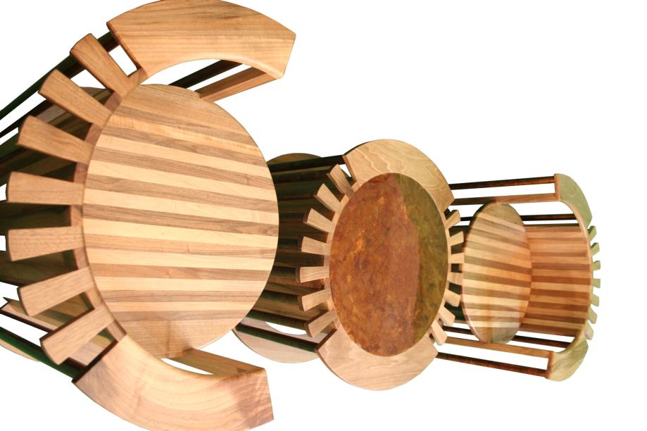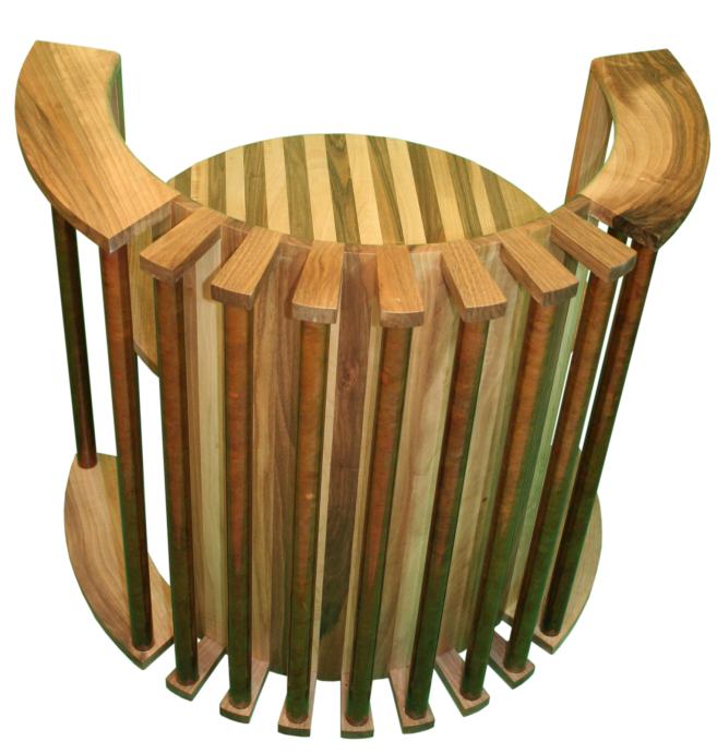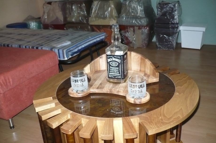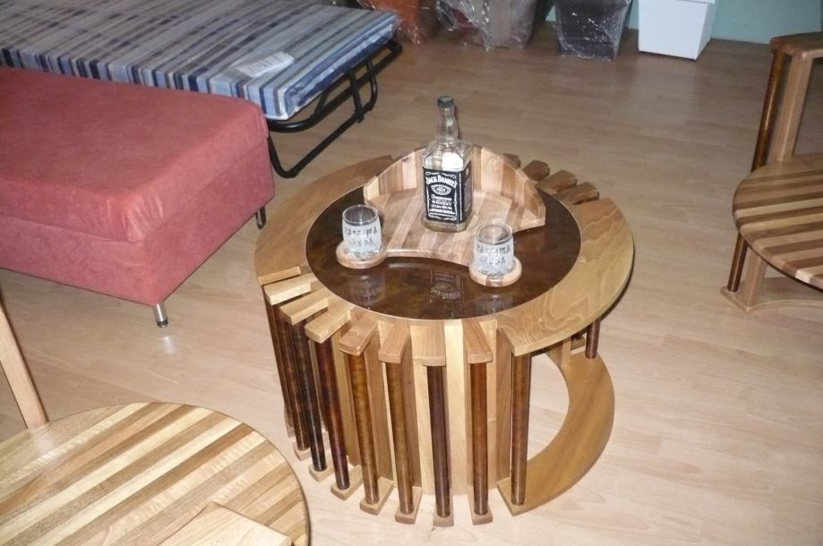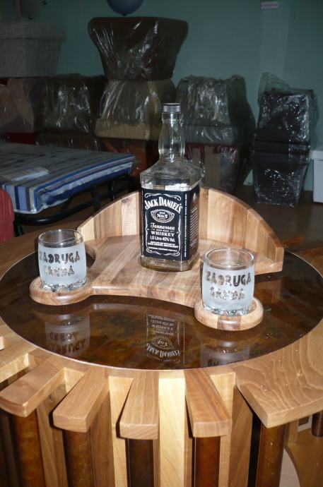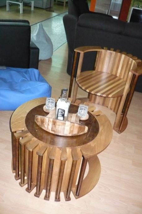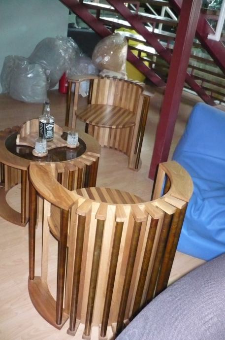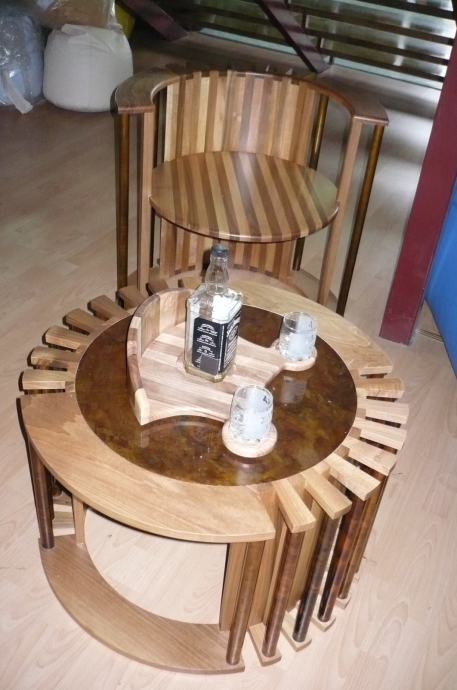 Sjedeća garnitura vlastitog dizajna i izrade. Birano orahovo drvo i patinirani bakar. Može za kuću ili ured. Dimenzije sjedeći dio r = 75 cm, visina 75 cm. stolić r = 75 cm, visina 40 cm. Informacije na 091 5093 605.