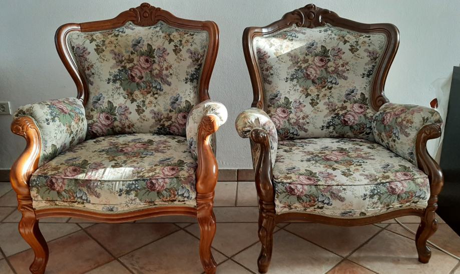 Prodajem dvije fotelje s tkaninom cvjetnog uzorka.