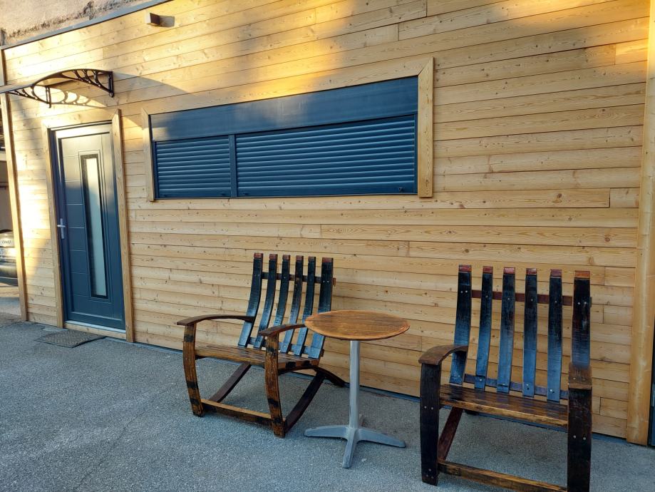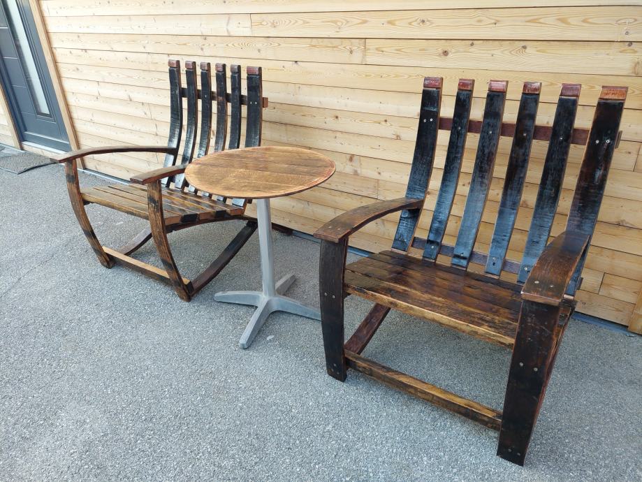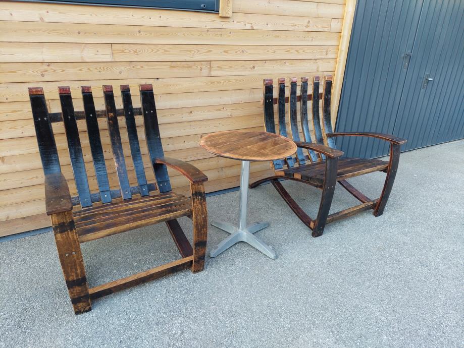 Fotelje su od hrastovih bačvi; postolje stola od aluminija , a ploča od hrastove bačve. Mogu biti na kiši, snijegu i suncu.