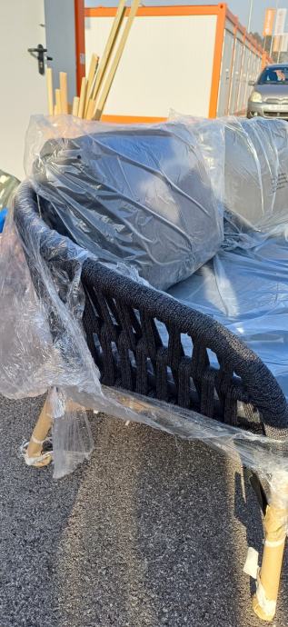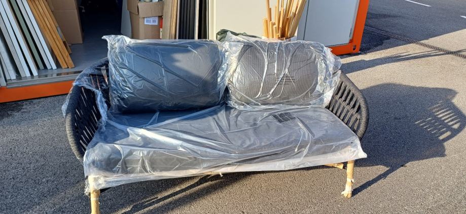 Novo, nekoristeno, zapakirano. Metalna konstrukcija, sjedalica, dva jastuka za naslon. Duzina 165, visina sjedista sa jastukom 43 cm , dubina 70 cm