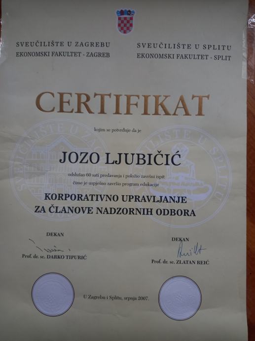 -Nadzornik za korporativno upravljanje sa certifikatom (prva generacija RH -sukladno struci mogućnost imenovanja u NO , revizione odbore,,,) -MBA