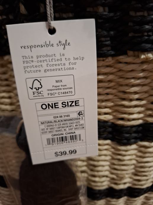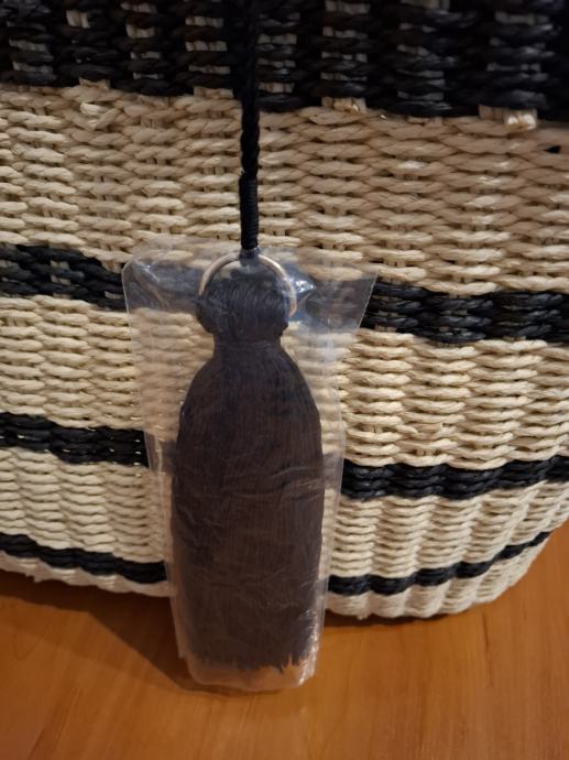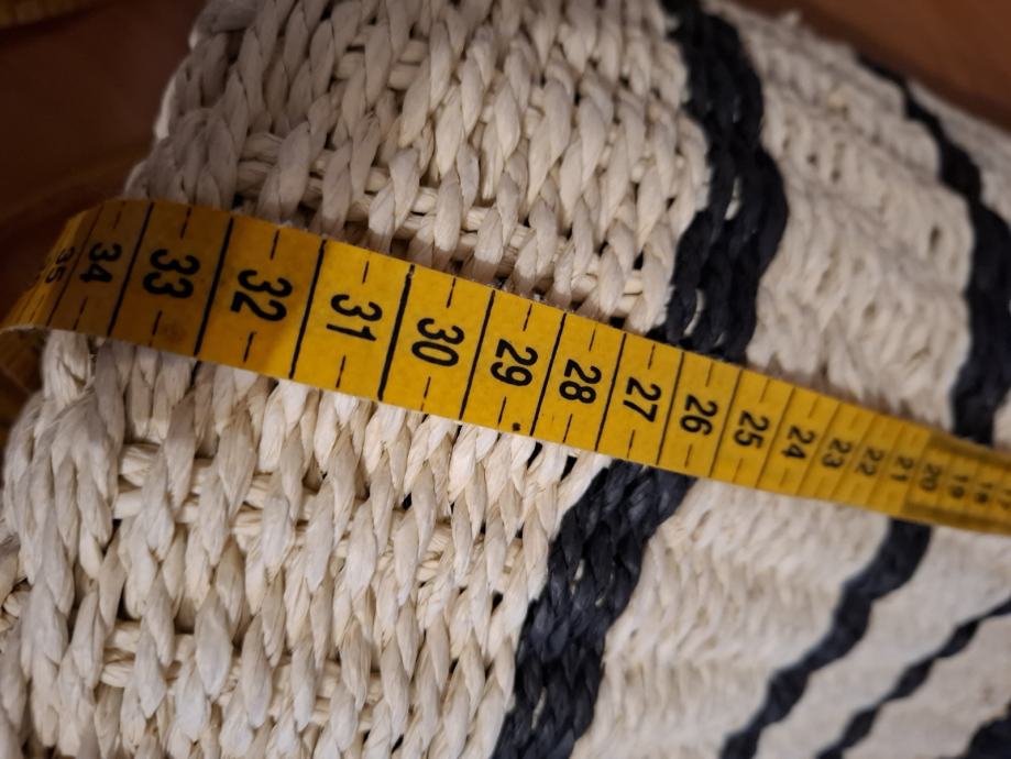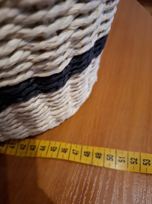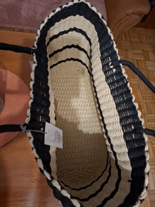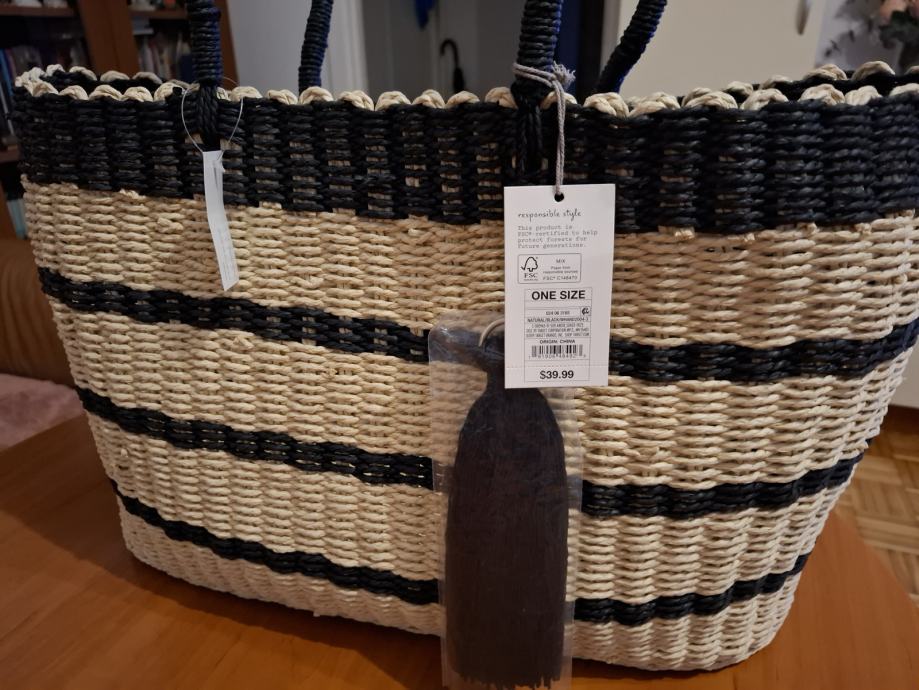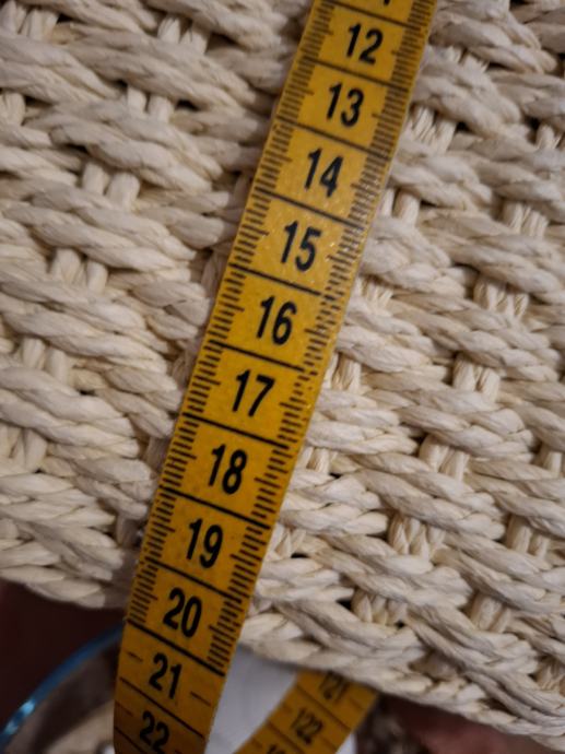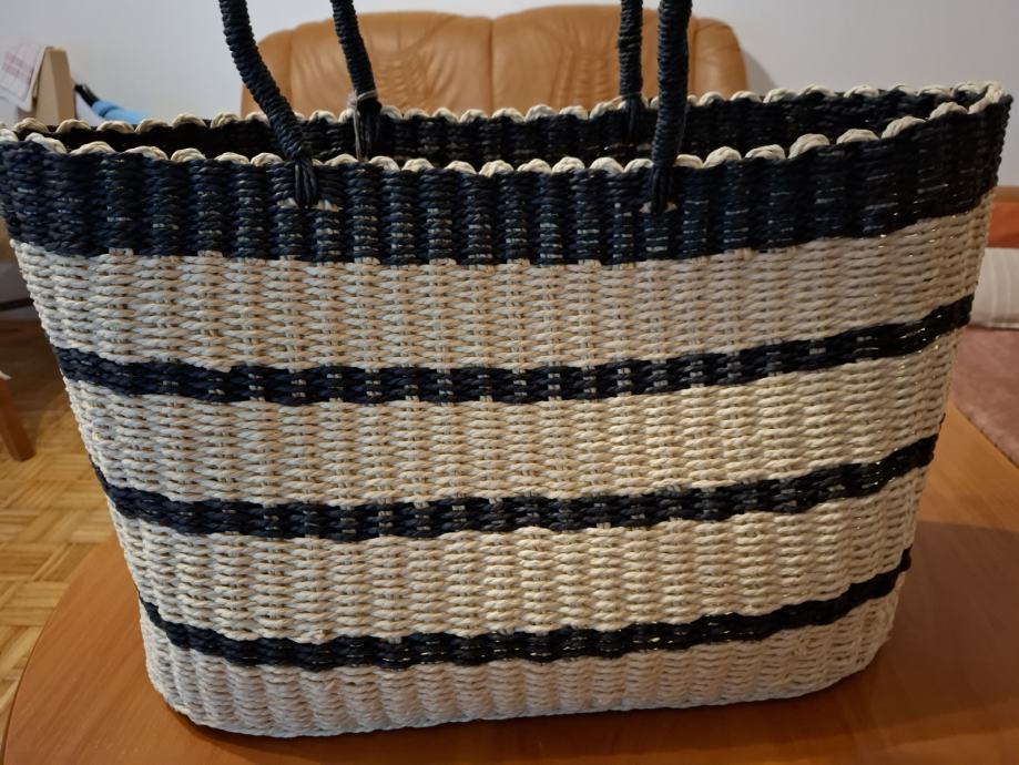 Prodajem novi s etiketom pleteni ceker za kupovinu ili plažu. Boja bež/crna. Veličina : širina sa strane 12cm, širina na dnu po sredini 20cm, dužina 46cm, visina 33cm. Plaćen 39,99 usd.