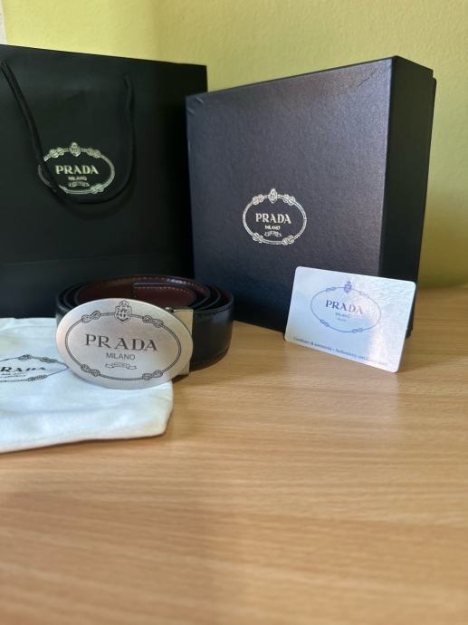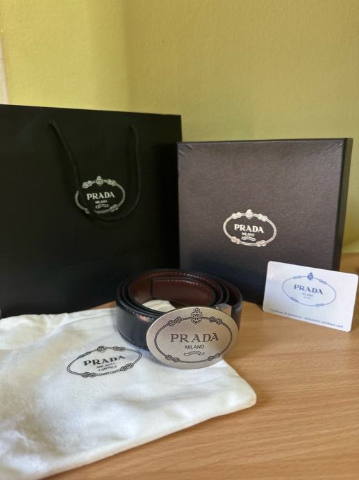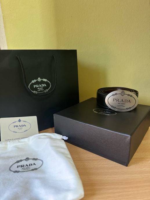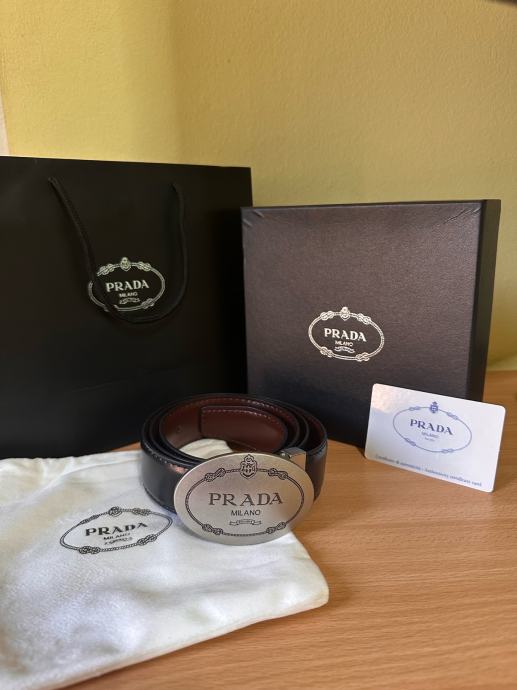 Elegantni originalni Prada kaiš, izrađen od kvalitetne kože, sa metalnom kopčom i ugraviranim logotipom. Dužina 105 cm, podesiv. Savršen za poslovne i casual kombinacije. Made in Italy.