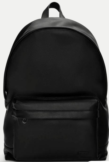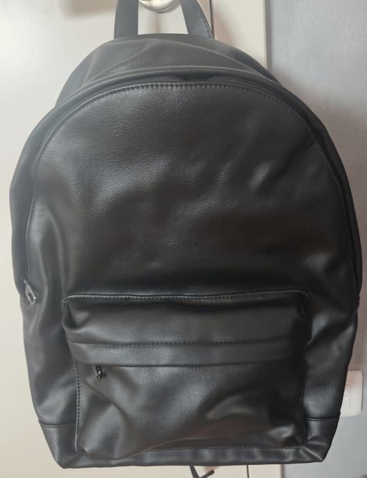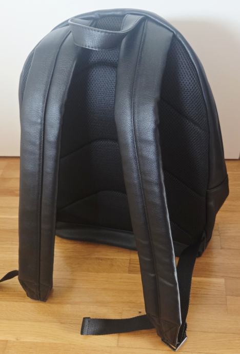 Crni ruksak urbanog stila s prednjim džepom, velikim unutarnjim pretincem za nošenje prijenosnog računala, kratkom ručkom i prilagodljivim naramenicama. Kopčanje patentnim zatvaračem.