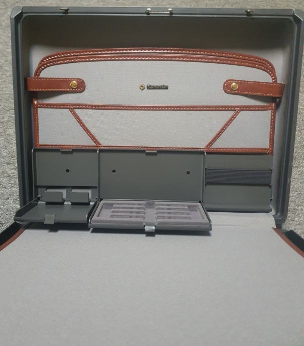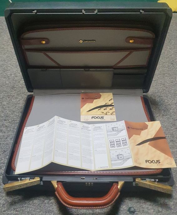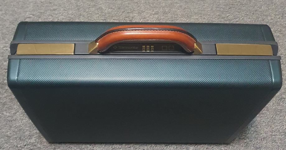 Samsonite kofer/Aktovka/Poslovna torba zlatni metalni dijelovi ,rucka i detalji od smedje koze,tamno zeleno metalno kuciste sa manjim ostecenjem moguce ispolirati nije jako vidljivo...