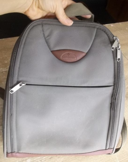 Prodajem rabljeni Samsonite ruksak. Pronađen, opran u perilici rublja (preživio je!) i na nekoliko mjesta kao da se materijal odvojio, kao da je iz 2 sloja, kao skaj što bude. Na prednjem džepu neke bijele fleke, nisam previše ribala, strah me bilo. I glavni cif se jedan zna razdvojit, drugi super (2 u 1 komadu). Korektno je od mene da kažem. Višak mi, imam ih sada stvarno dosta. Ojačano dno, uspije se strpati unutra fascikla A4 formata, visina cca 30 cm. Džep naprijed, džep na leđima sa cifom, unutra veliki pretinac bez pregrade, sa džepom za manji mobitel sa jedne strane i džep sa cifom sa druge strane. Ako nekome posluži, rado dam za simboličnu cijenu od 1 €.