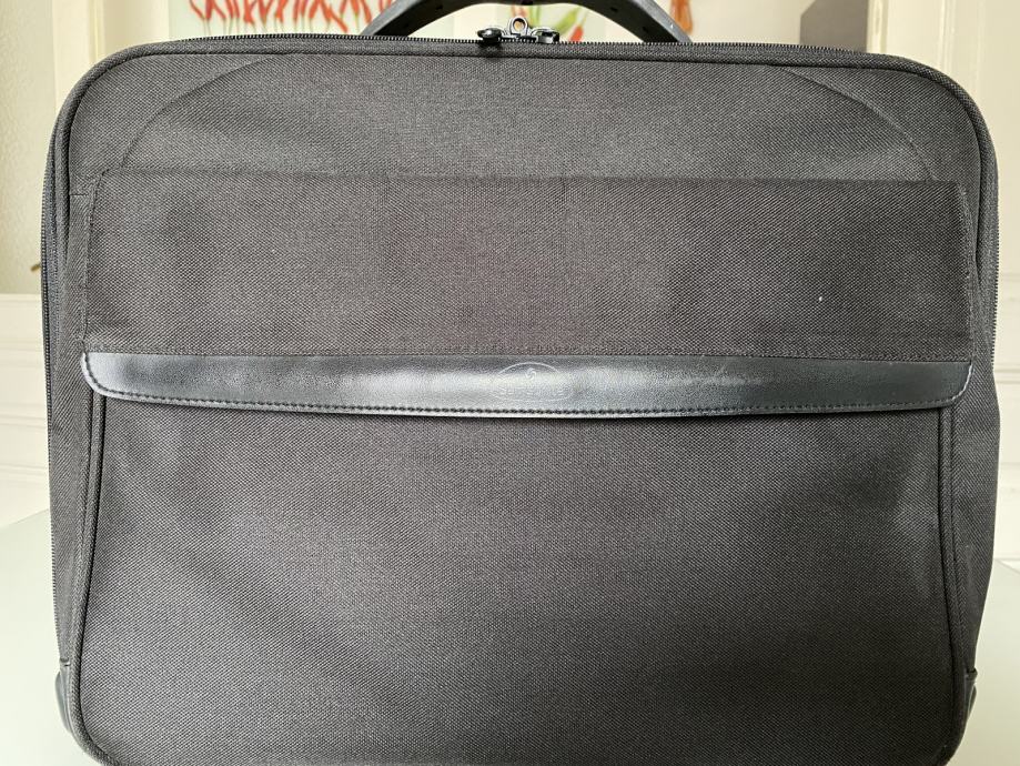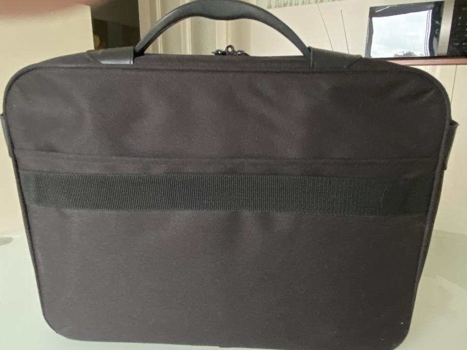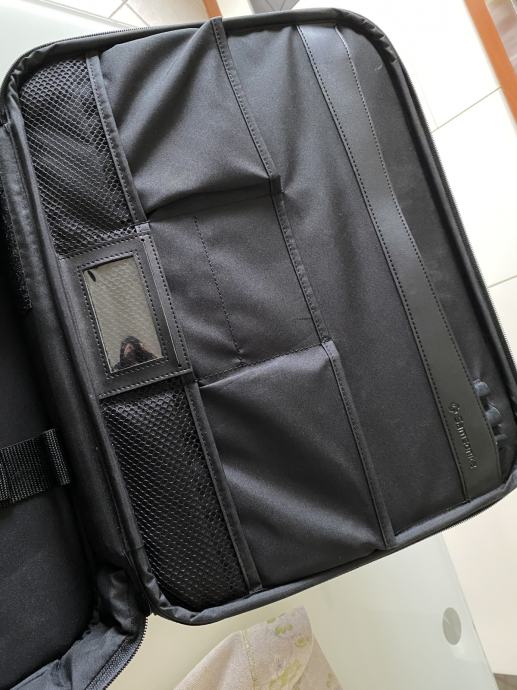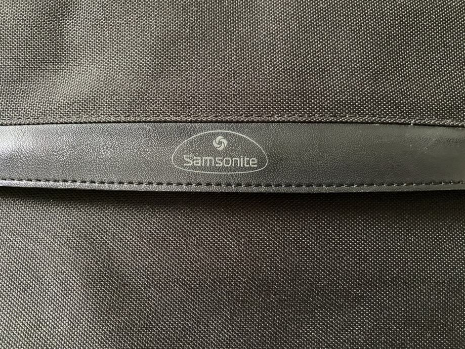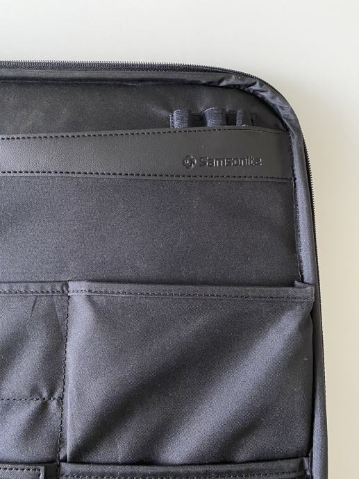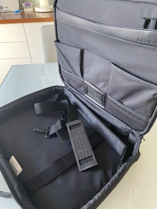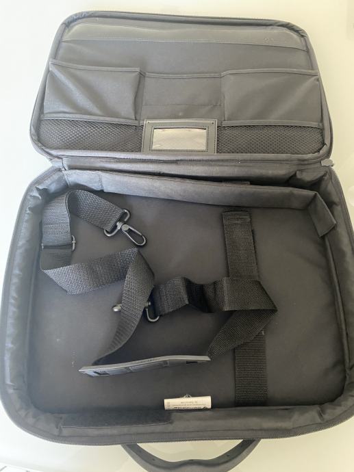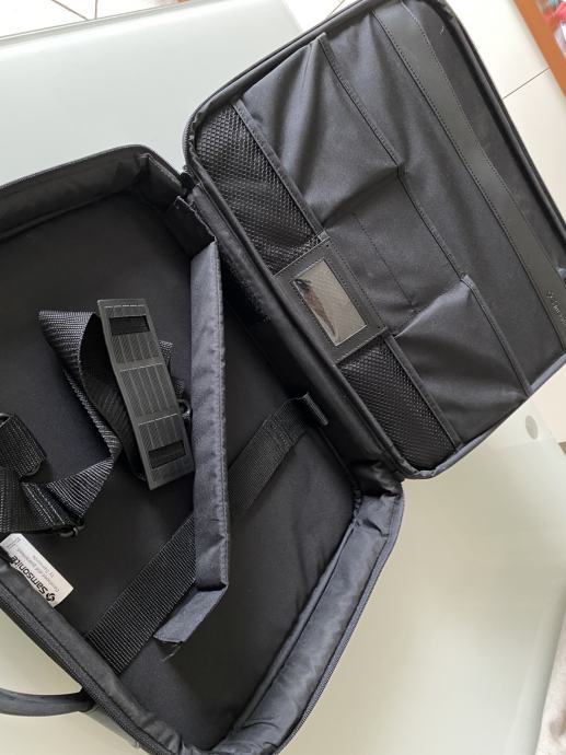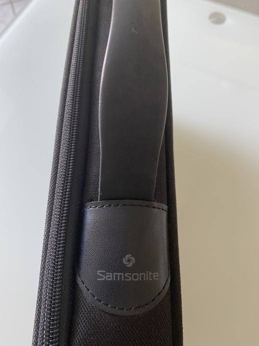 Nekorištena Samsonite torba za prijenosno računalo, dimenzija 34 x 44 cm. Izrađena od čvrstog, nepromočivog materijala s ručkom za nošenje u ruci i duljom za nošenje preko ramena. Jedan prednji pretinac koji zatvara klapna s logom brenda i jedan stražnji. Unutrašnjost s pretincima za dokumente, mobitel, olovke... i osiguranjem računala.