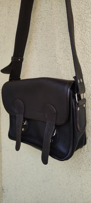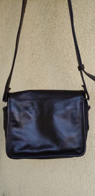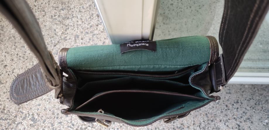Kvalitetna kožna torba, podstavljena, s dužim, širim remenom, veličine cca 28 x 22 x 12 cm. Ima više unutarnjih pregrada i džepova, od toga su dva sa zatvaračem.