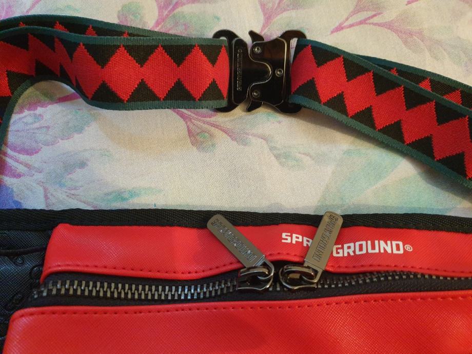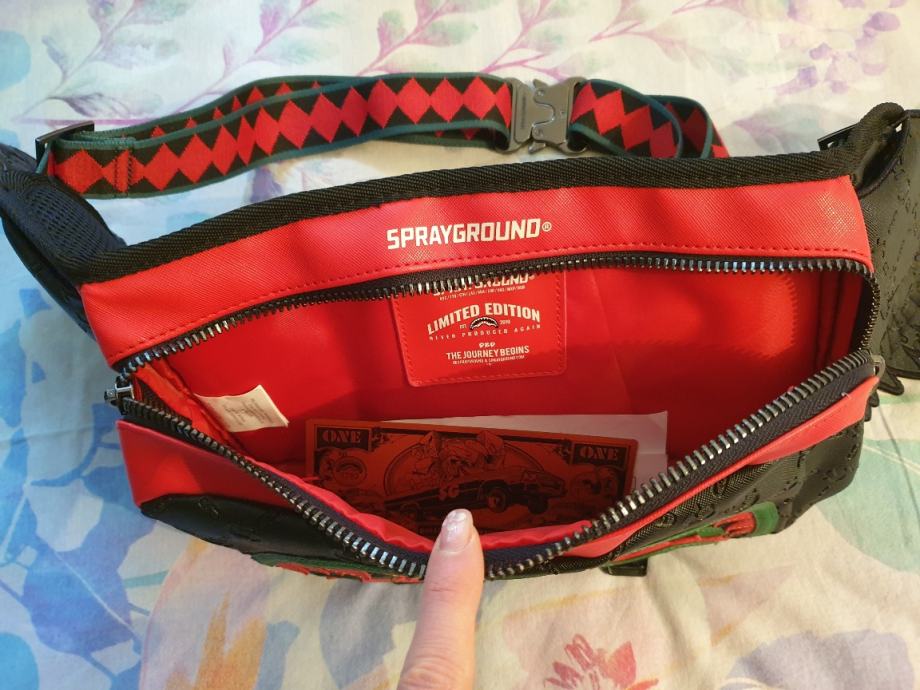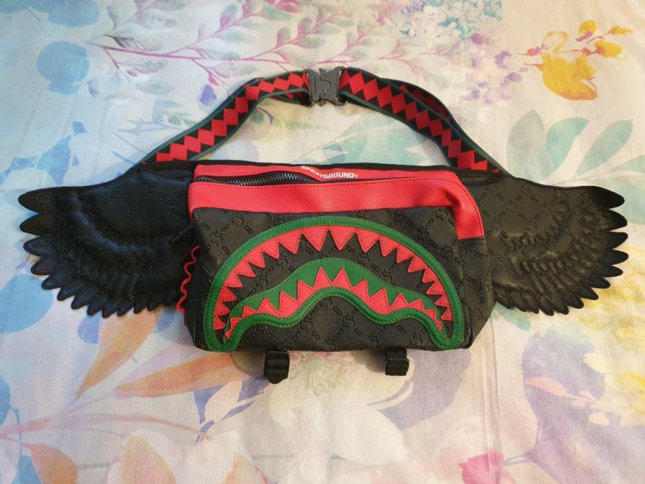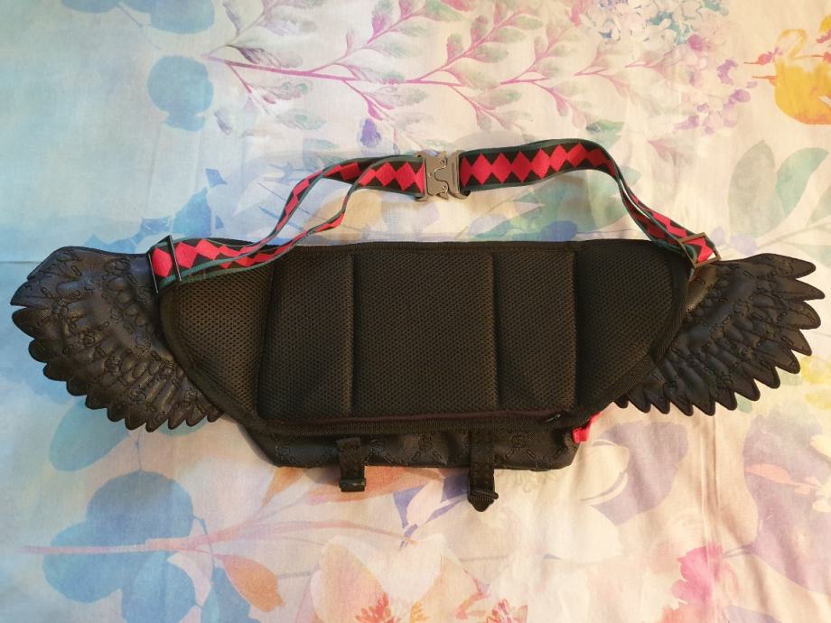 Neobična mala torbica za nošenje preko ramena, mogli bismo reći ruksak ali nema naramenice, samo jedan remen. Remen je na slici maksimalno skraćen, dakle prevelik da se nosi oko pasa, može se eventualno nositi bočno preko prsa. Jedan pretinac, dvostruki cif. Novo niti jednom korišteno. Kombinacija "gucci" boja, crna da crvenim i zelenim. Osnovni crni materijal torbe i krila s reljefnim uzorkom branda. Šaljem po uplati, može i pouzećem, moguća primopredaja Zg centar-istok.