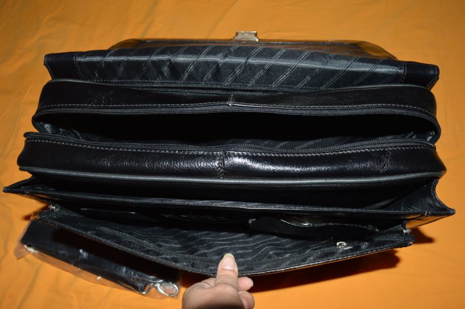 Potpuno nova s etiketom od kože, crne boje sa puno pretinaca. Ima ključić pa se može još dodatno osigurati. Ima 4 velika pretinaca, 1 je sa raznim dodacima npr. za mobitel, za olovke, kartice...Od iza još 1 pretinac na cif i unutra još 2 na cif. Vrlo ugodna ručka ali nema naramenicu. Dužina 42 cm, visina bez ručke 34 cm, širina dna 14 cm.