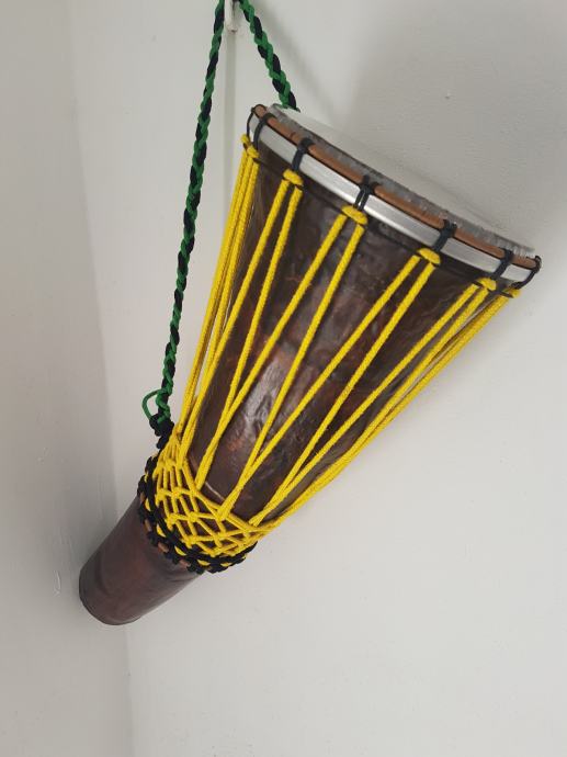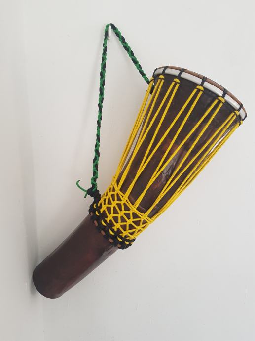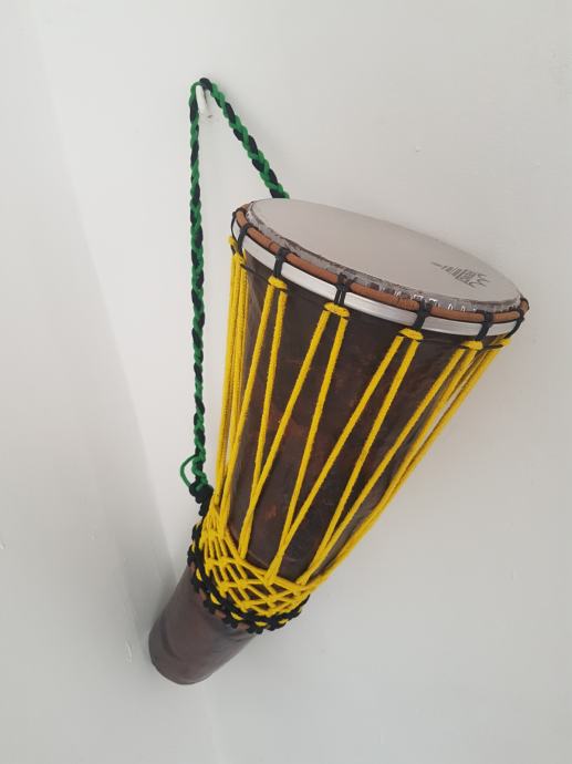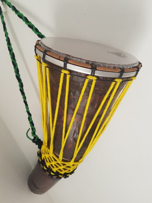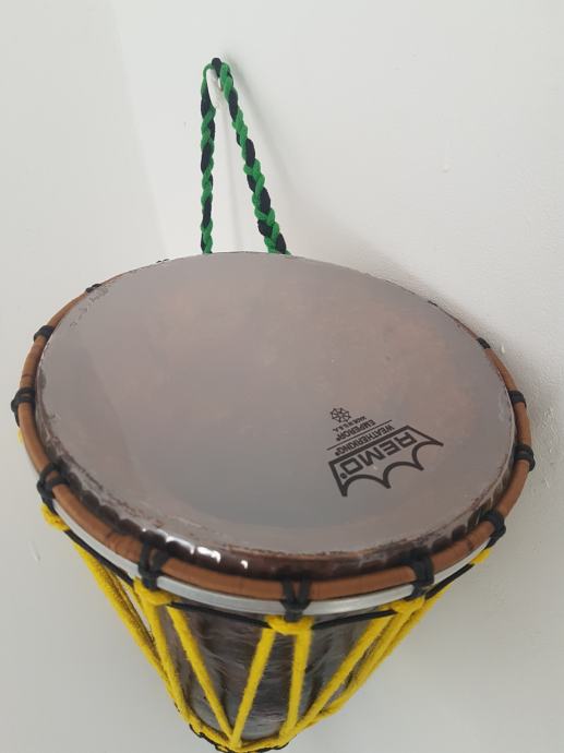 Ovaj Djembe bubanj je napravljen da na njega paše bilo koja tvornička koža (plastična opna za bubnjeve) od 8 inča ,koju možete lako kupiti jer su svugdje dostupne. Ovaj bubanj može biti 2 u 1 odnosno može se na njega montirati i kozja koža samo za to treba imati opcionalno još jedan gornji obruč koji se može naručiti kod mene. Gornji obruć je okomotan (wrap) sa izdržljivim koncem otpornim na habanje.