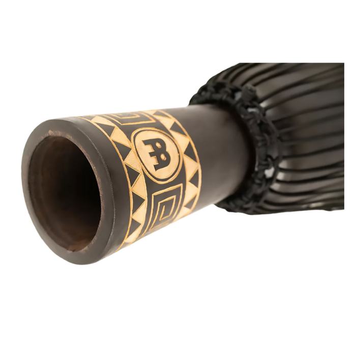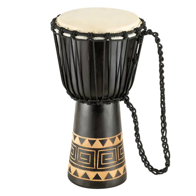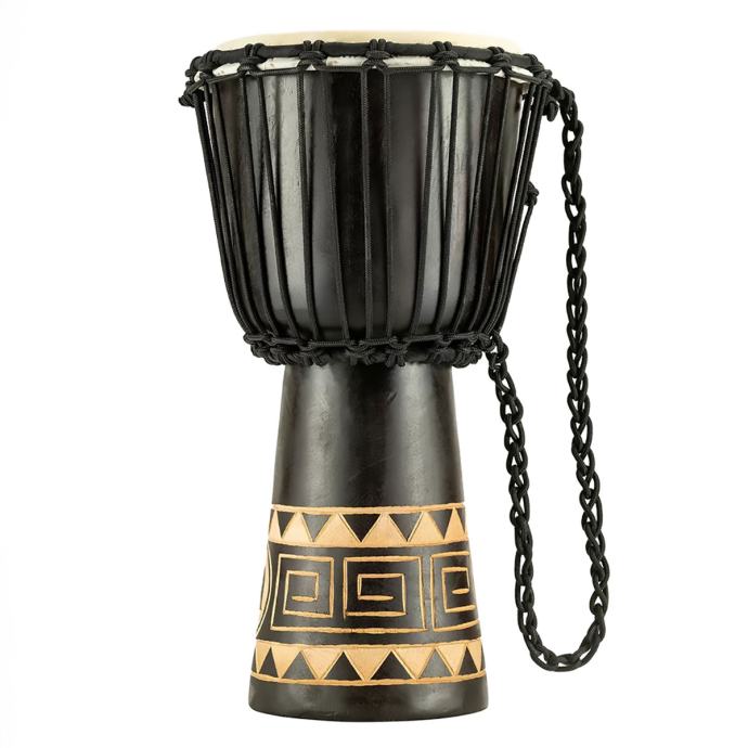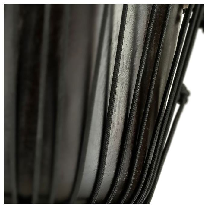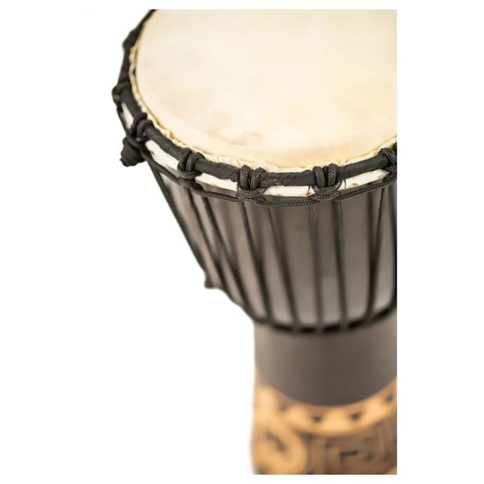 Školjka ovih djembi izrezana je iz jednog čvrstog dijela mahagonija uzgojenog na plantaži te sadrži lijepe ugravirane ukrase na dnu. Sadrži i tradicionalni Mali Weave sustav štimanja.