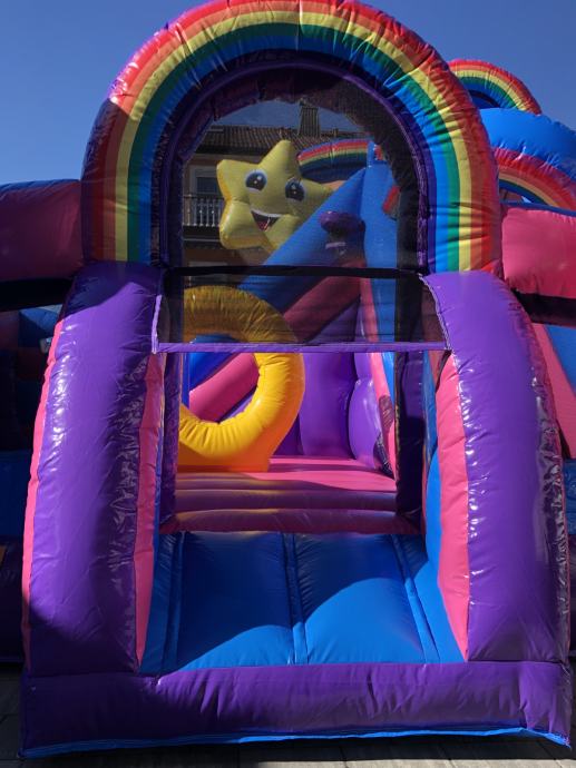 Opis proizvoda: 2 velika tobogana, prostor za skakanje i penjanje, pregrade, stijena za penjanje.