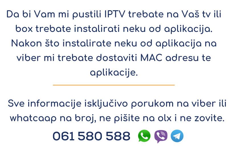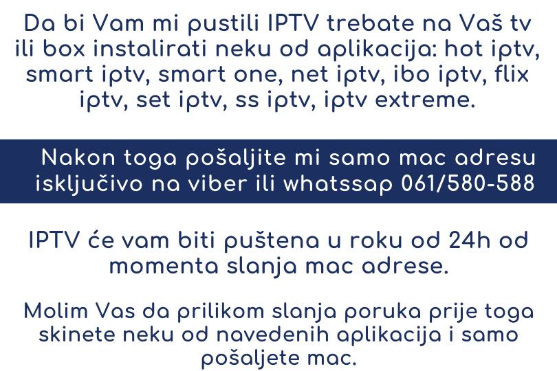Da bi Vam pustili iptv trebate na vaš box instalirati neku od apilkacija i poslati mac adresu te aplikacije.