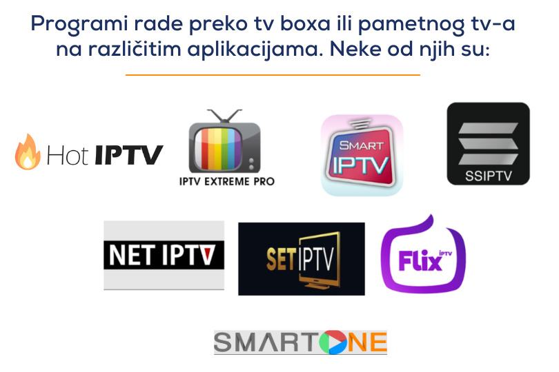Programi rade preko različitih aplikacija, a neke od njih su: hot iptv, smart iptv, net iptv, iptv extreme, flix, ssipt, set iptv, smart one itd.