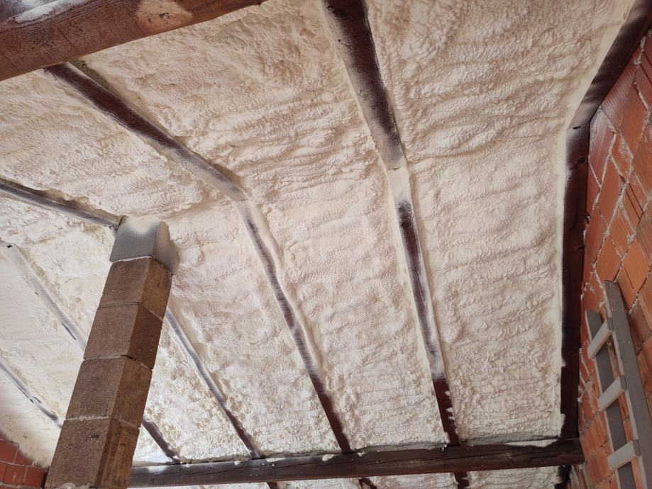 Izolacija krovišta TERMOIZOLACIJA KROVIŠTA PJENOM, NANOŠENJEM PRSKANJEM IZMEĐU ROGOVA, Sprej pjena je sustav barijere koja učinkovito brtvi zidove, podove, krovišta i stropove te spojeve prozora od vanjskih atmosferskih utjecaja. Te ujedno dolazi kao zvučna i toplinska izolacija