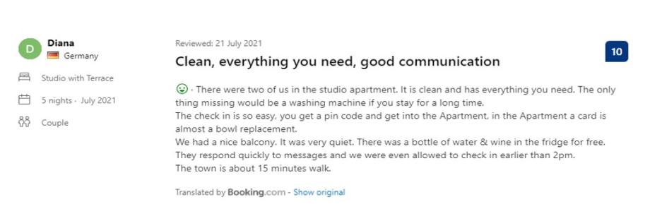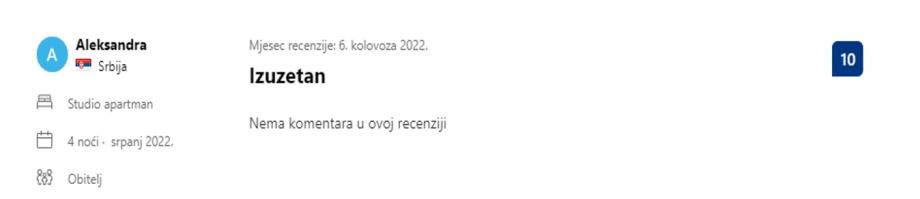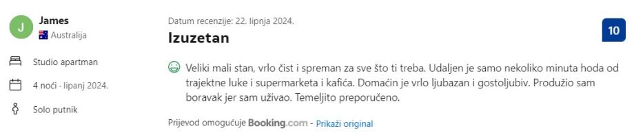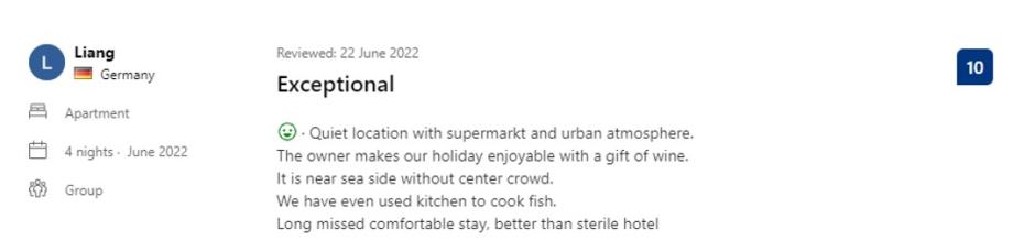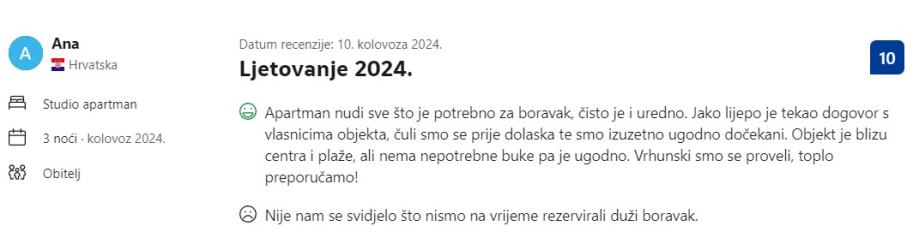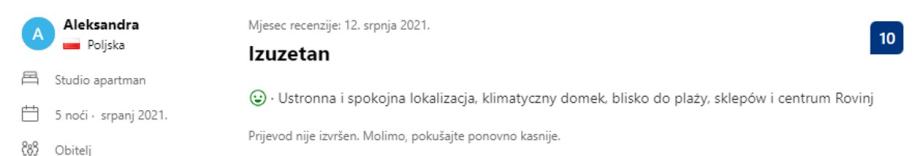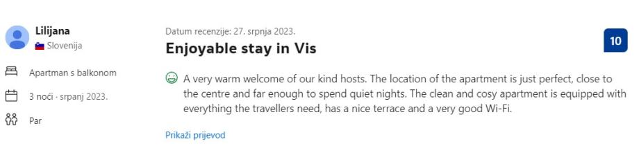 Naš rad u turizmu i organizaciji smještaja nagrađen je ocjenama / recenzijama gostiju koji su boravili u apartmanima u gradu Visu i Rovinju, a za koje smo organizirali smještaj i brinuli o gostima od prvih upita, preko rezervacije smještaja i sve do njihova napuštanja apartmana. Samo neke od mnogih odličnih recenzija objavljenih na platformi booking.com pridružene su ovome oglasu.