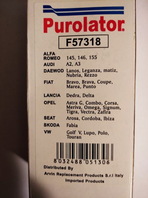 PRODAJEM POTPUNO NOVI FILTER GORIVA " PUROLATOR " F57318 " KOJI ODGOVARA ZA MNOGE MARKE VOZILA ( POPIS VOZILA SE NALAZI NA NJEGOVOJ AMBALAŽI - VIDI SLIKE ( AUDI, DAEWO,FIAT,LANCIA,OPEL,SEAT,SKODA,VW ) !