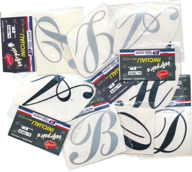 Naljepnice Inicijali imamo u ponudi u crnoj i srebrnoj boji visine 5 cm. Folija ( PVC ) od koje su izrađene je otporna na sve vremenske