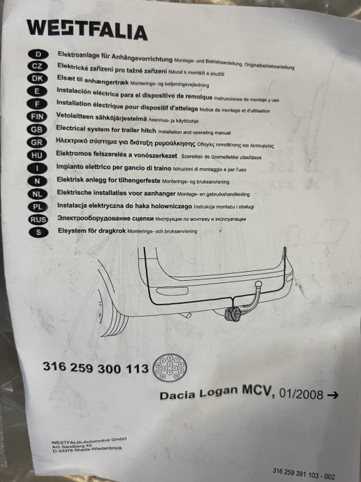KUKA ZA AUTO WESTFALIA DACIA LOGAN MCV 01/2008.- 316259600001 NOVA