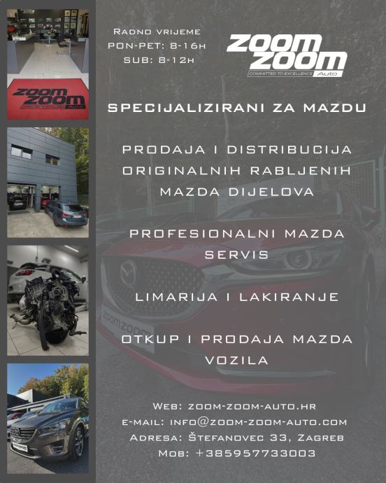 Zoom-Zoom Auto d.o.o. nastoji osigurati točnost i ažurnost svih informacija, no moguće su promjene proizvoda i usluga koje nisu odmah evidentirane. Ne preuzimamo odgovornost za moguće netočnosti ili štetu nastalu korištenjem sadržaja s ove stranice. Zadržavamo pravo izmjene specifikacija u bilo kojem trenutku bez prethodne najave.