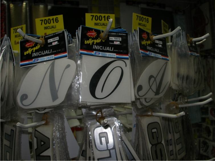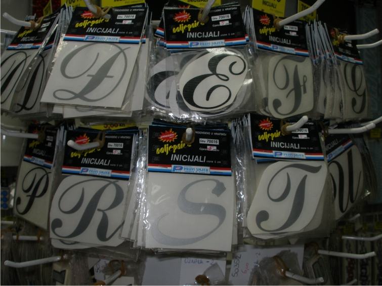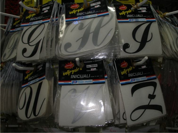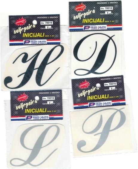 Naljepnice Inicijali imamo u ponudi u crnoj i srebrnoj boji visine 5 cm. Folija ( PVC ) od koje su izrađene je otporna na sve vremenske
