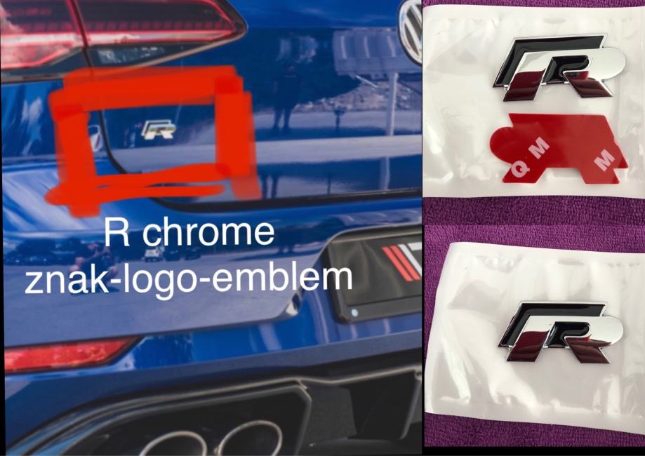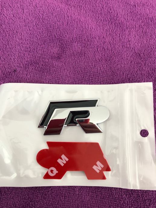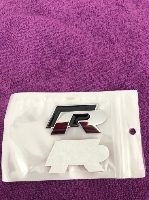 R znak je u R slovo chrome + crna pozadina boji kao i na originalu kako dolazi na Volkswagenovim modelima VW Golf R, VW Tiguan R, VW Touareg R, VW Polo R, VW Scirocco R itd.