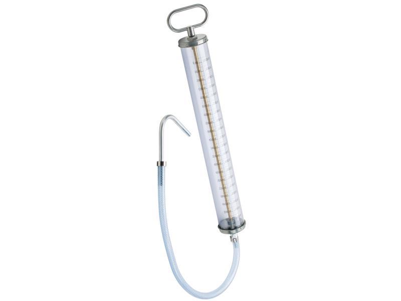 Ručna štrcaljka s prozirnim tijelom od kaljene plastike i ljestvicom za točno doziranje. Punjenje teško dostupnih mjenjača olakšava savitljiva PVC cijev sa zakrivljenim krajem.