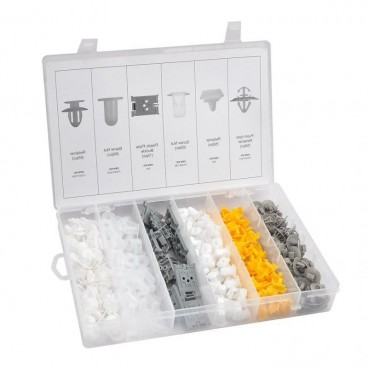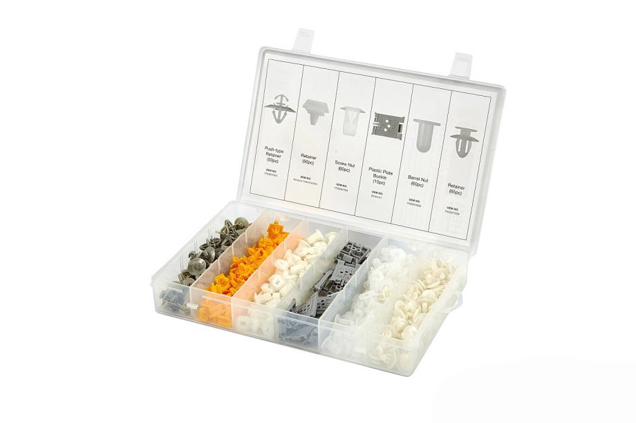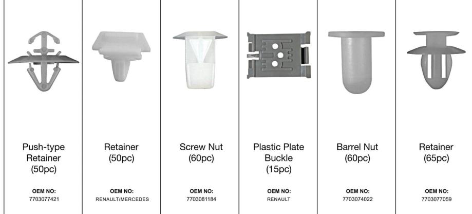 Set od 300 kopči za Renault za pričvršćivanje vrata, panela, rešetki, branika i ostalih dijelova unutarnje ili vanjske karoserije ovih vozila. Uključuje 6 različitih vrsta spajalica i kopči izrađenih od plastike. Za različite Renault modele