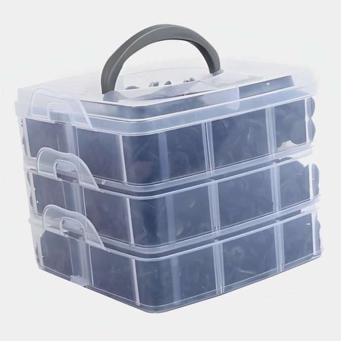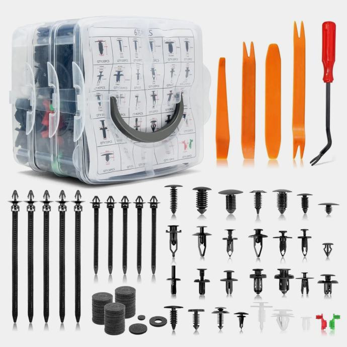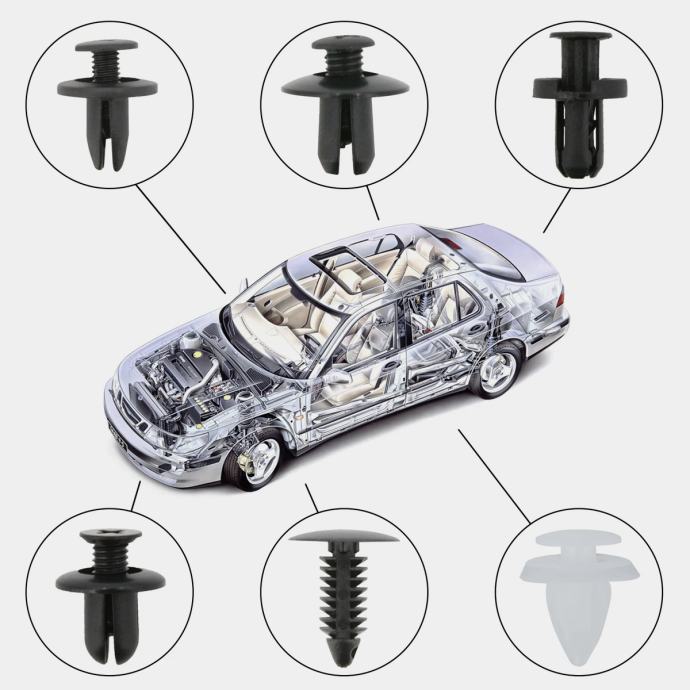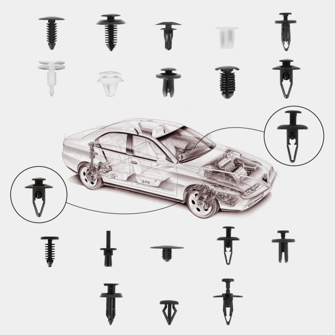 Komplet najlonskih kopča različitih oblika i veličina za bočne pragove, branike i druge dijelove karoserije. Dolazi u praktičnoj kutiji, idealno za zamjenu starih ili oštećenih držača.