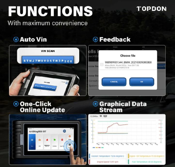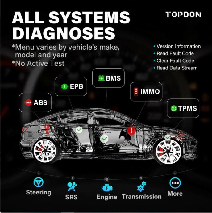 SVA DOSTUPNA DIJAGNOSTIKA SUSTAVA : ️Ovaj TOPDON dijagnostički skener može dobiti analizu na razini OE ECM-a, mjenjača, ABS-a, zračnog jastuka, SAS-a, DPF-a, EVAP-a, TPMS-a, BMS-a, EPB-a, među ostalim dostupnim sustavima u vozilu. Povucite, očistite njihove kodove; isključite povezana svjetla upozorenja; provjerite podatke zamrznuti okvir; pogledajte prijenos uživo u detaljnom tekstu, spojeni grafikon koji trebate za dijagnosticiranje, popravak i održavanje za većinu marki i modela automobila diljem svijeta. ⛔NIJE dvosmjerni dijagnostički skener. Aktivni test NIJE dostupan.