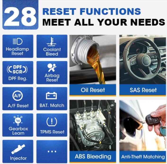Uživajte u skočnim uputama za jednostavan pristup do 28 najpopularnijih usluga održavanja u ovom dijagnostičkom alatu: ulje, SAS, EPB i resetiranje tlaka u gumama; Kodiranje injektora; SAS kalibracija; ABS krvarenje; DPF regeneracija; Podudaranje baterije, leptira za gas, prednjeg svjetla, mjenjača i zaštite od krađe (SAMO za azijske automobile s niskim stupnjem IMMO); EGR adaptacija; Učenje zuba; Inicijalizacija krovnog otvora.