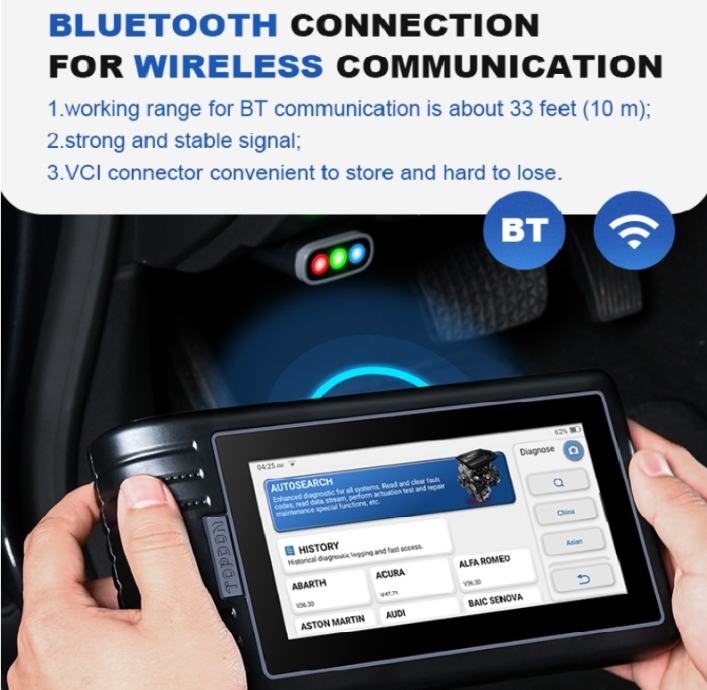 BEŽIČNO + AUTOVIN : ️Iskusite bežičnu dijagnostiku bez obaveza uz veliki radni domet od 10 metara zahvaljujući uključenom ključu Blue-tooth 4.0 VCI. Automatski identificirajte podatke o marki, modelu, godini vozila i brzo pronađite pravi softver jednim dodirom na ovom alatu za skeniranje, uz potpuno, jasno i točno izvješće koje se automatski generira za daljnju analizu. *AutoVIN ne radi na SVIM automobilima. Podatke o VIN-u slobodno unesite ručno.