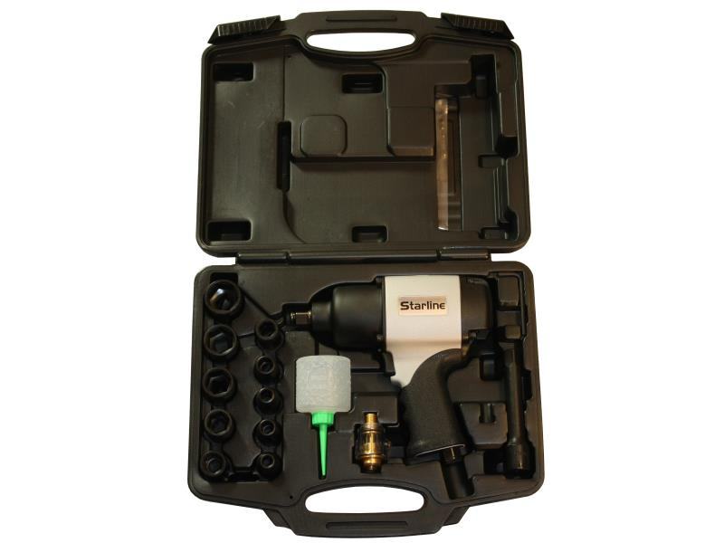 Udarni zatezač za set sa glavama dimenzija 9, 10, 11, 13, 14, 17, 19, 22, 24, 27, nastavkom produžetka, sustavom za podmazivanje i pištoljem za podmazivanje.