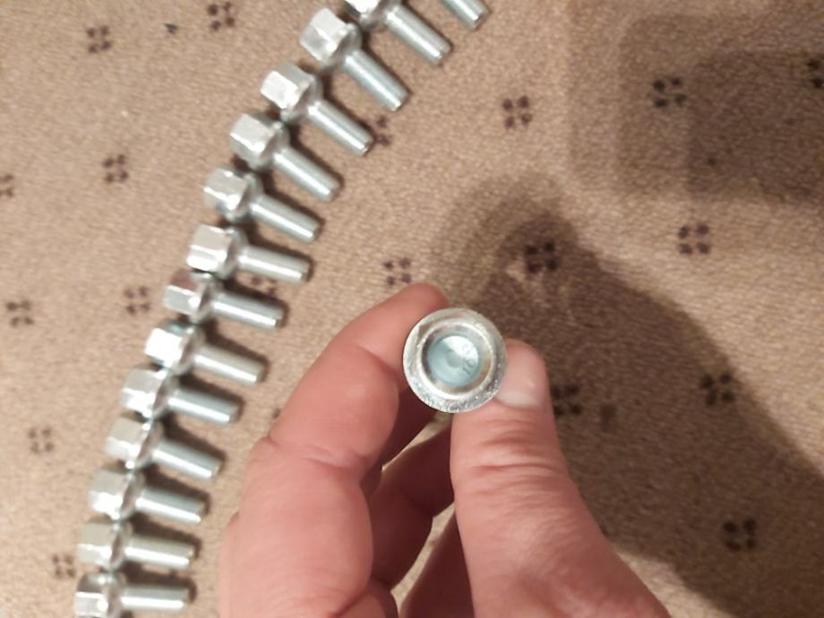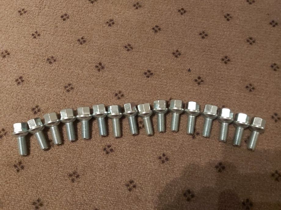 Prodajem potpuno nove vijke m12, navoja 1.50. Duzina navoja je 25mm, duzina vijka 40mm i sirina glave 17mm. Posjedujem 16 komada novih i 2 identicna vijka koristena(nisu na slici). Cijena 100kn za komplet fiksno.