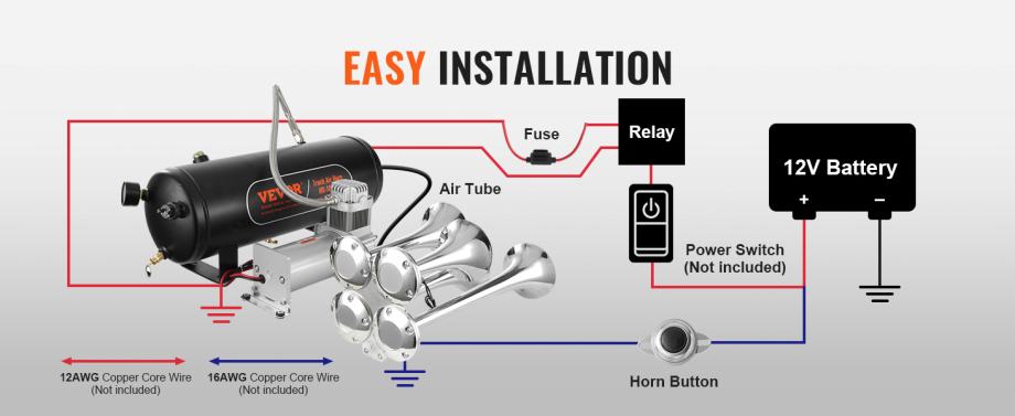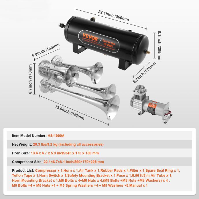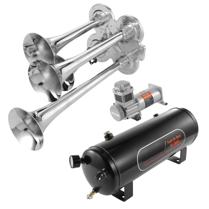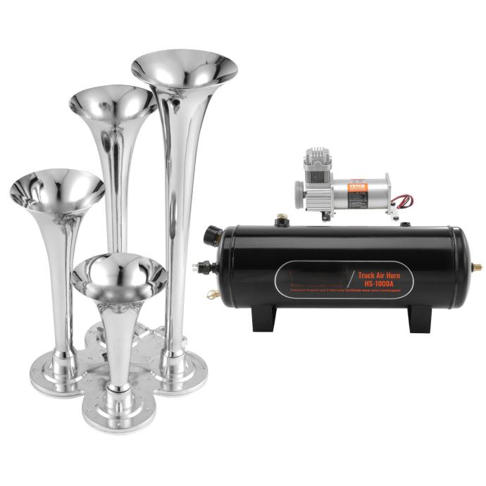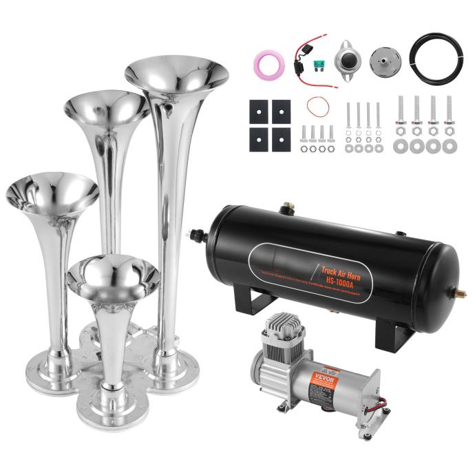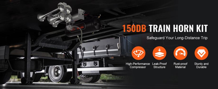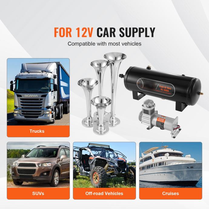 Sirena sa zvukomk vlaka isporučuje snažan zvuk od 150dB sa snažnom penetracijom, utjeruje strah u kosti. Idealan za vožnju na duge relacije, oštre zavoje i nepovoljne vremenske uvjete. Učinkovito upozorava automobile, pješake i životinje. Komplet sirena uključuje 4 trube za zrak, solenoidni ventil, spremnik od 10L, kompresor i cijevi. (Napomena: prekidač napajanja i kabel nisu uključeni.)