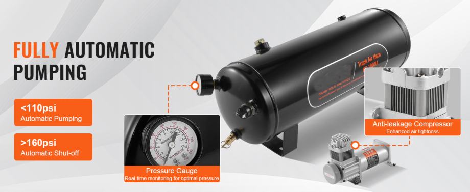 Kompresor radi u rasponu od 110-160 psi, s osjetljivim mjeračem za praćenje tlaka u stvarnom vremenu. Automatski se napuhava ispod 110psi i zaustavlja na iznad 160psi kako bi spriječio prekomjerni tlak. Spremnik održava optimalni tlak zraka, pojačan osiguračima za zaštitu kompresora i drenažnim čepom za jednostavno ispuštanje vode.