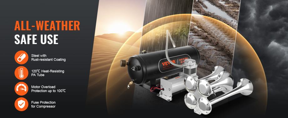 Komplet sirena za kamione izrađen je od teške legure cinka i čelika s premazom protiv hrđe. Zračne sirene otporne su na koroziju, udarce i habanje. Zračni kompresor ima strukturu koja ne propušta i čvrsto zavareni spremnik zraka kako bi se smanjio rizik od propuštanja.