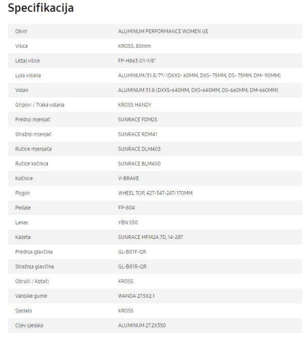 Za ugodno i brzo mijenjanje brzina zaduženi su Sunrace stražnji i prednji mjenjač, a zahvaljujući Kross suspenzijskoj vilici sa 80mm hoda, vožnja po neravnim površinama i svladavanje rubnjaka više neće biti problem. V-Brake kočnice provjerenog su i poboljšanog dizajna koji će vam pomoći da se zaustavite u svim uvjetima i u svakoj situaciji.