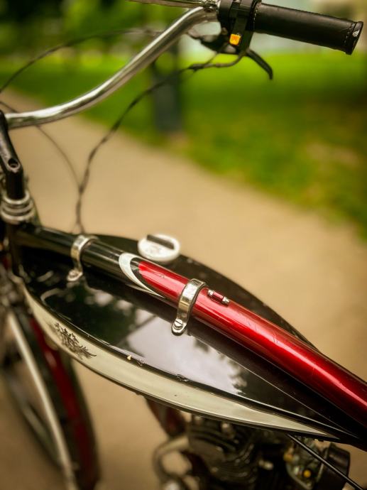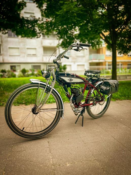 Tražite zaista poseban način prijevoza? Ovaj predivan, motorizirani bicikl inspiriran vintage stilom spreman je za novog vlasnika! Kombinirajući klasičnu estetiku s praktičnošću malog motora, nudi nevjerojatno zabavnu i učinkovitu vožnju. Savršen za kolekcionare, entuzijaste ili bilo koga tko traži nedvojbeno cool način prijevoza.