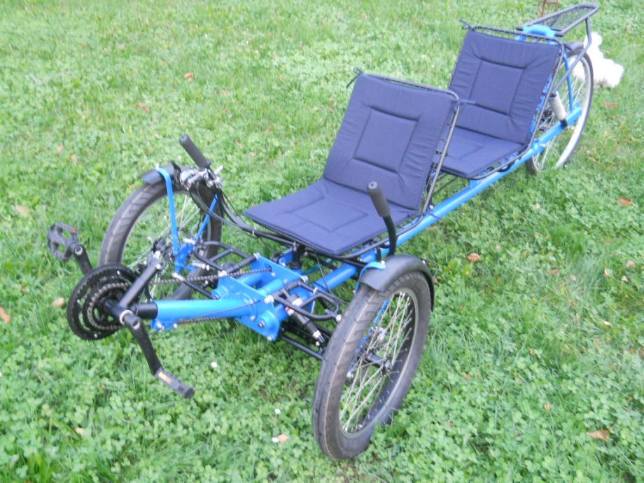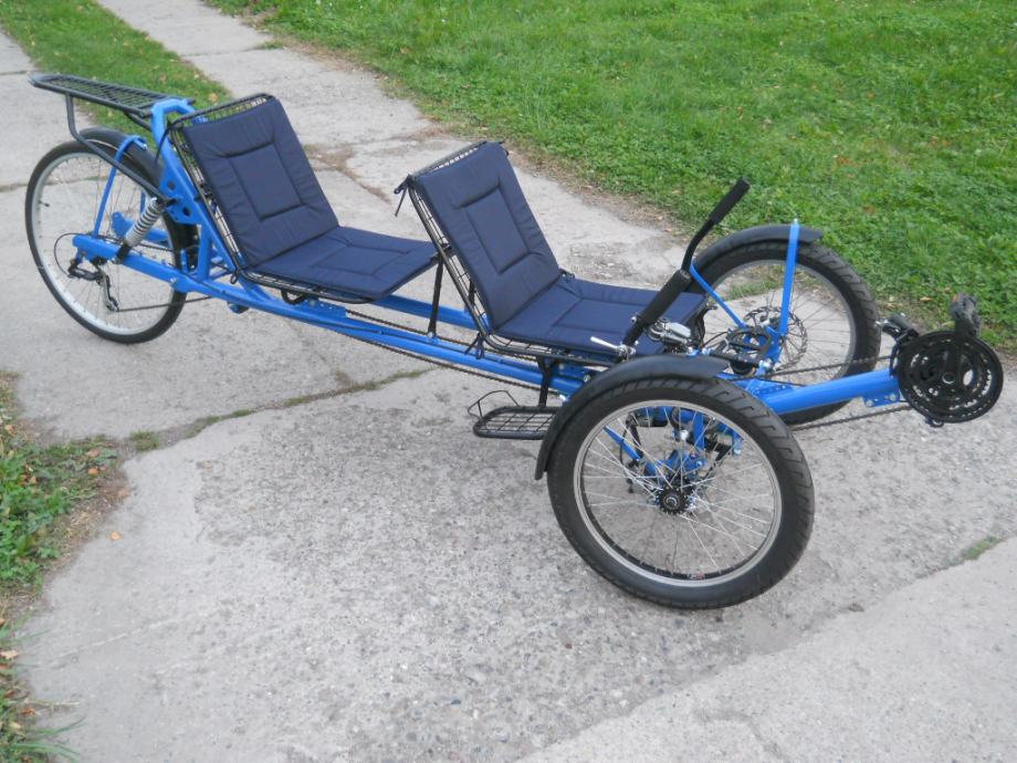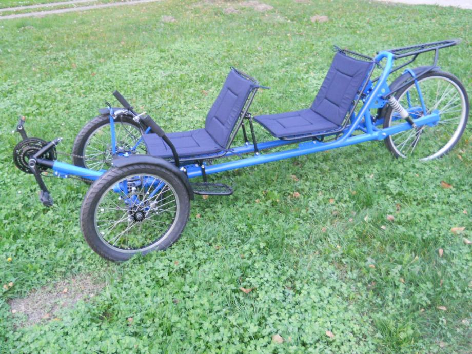 Unikat ,ručni rad .Ram čelik tankozidne cevi .Težina trajka 53kg .Hidraulične kočnice na sva tri točka. 3x7 brzina .Napred moto gume Sava SP2.Zadnja viljuška konstruisana za mogućnost ugradnje točka od 20" do 26" sa elektro motorom (bez preprabke viljuške) .Kompletan ram i detalji plastificirani.Prednje ogibljenje sa duplim ramenima ,teflonskm čaurama u oslanjanju i zglobnim ležajevima na kraju fi 10 mm u svakom osloncu ramena .Rukavci sa osovinom od 15 mm .Glavčine sa mašinskim lezajevima .Geometrija prednjeg ogibljenja sa zaturom i nagibom i mogućnošću podešavanja .Amortizeri prednji standardni mehanički (moguća ugradnja gasnog,hidrauličnog ) Nazad klasični moto amortizeri...