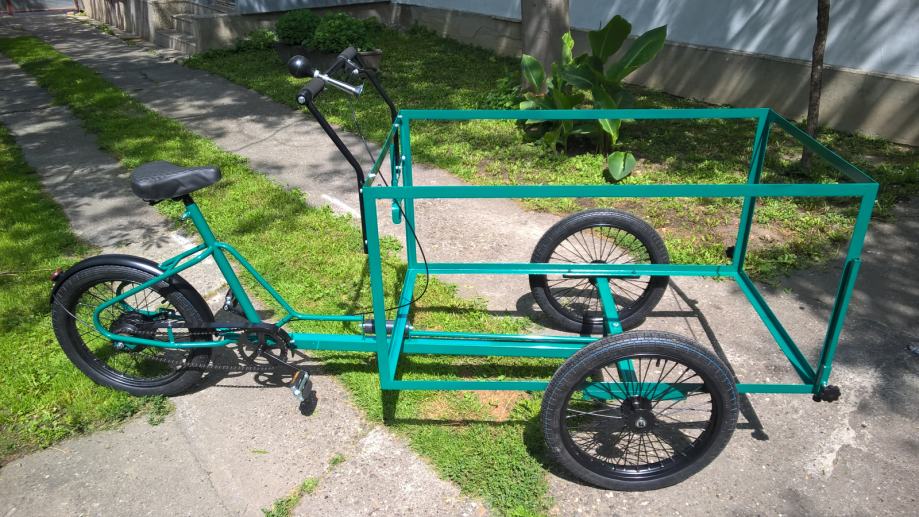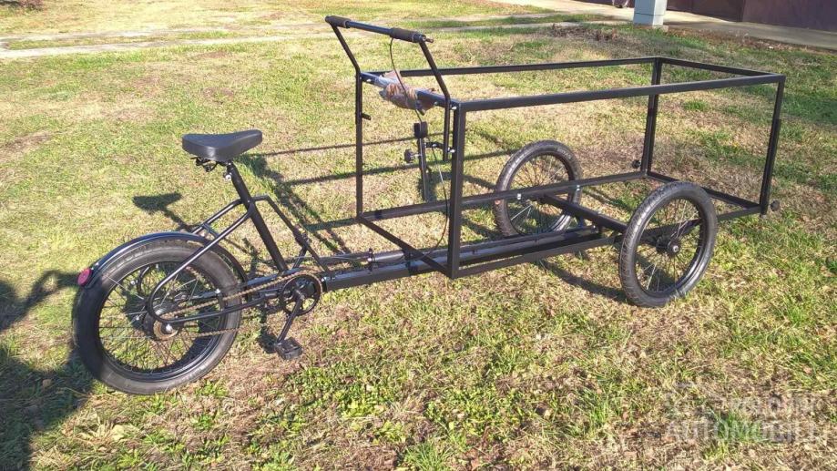 Neto nosivosti do 150kg. Mašinski ležajevi u svim osovinama . Točkovi moto čelični sa žicama debljine 3 mm. Dimenzije točka 16" sa moto gumama 16x 2,25 . Doboš kočnica u zadnjem točku . Težina tricikla 40 kg Dimenzije teretnog prostora 1200x700x600 mm. PS. dimenzije teretnog prostora se mogu korigovati u zavisnosti od namene. . .
