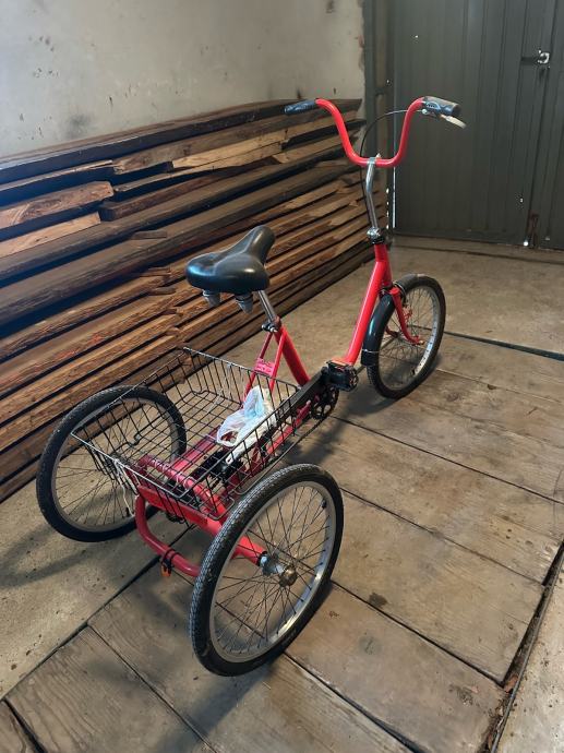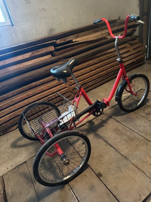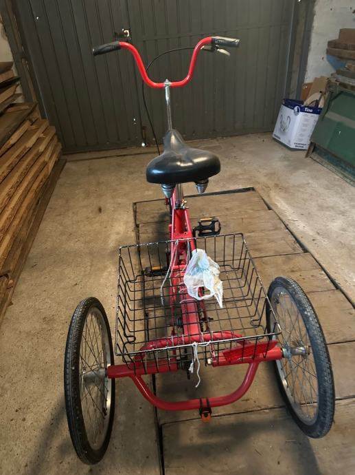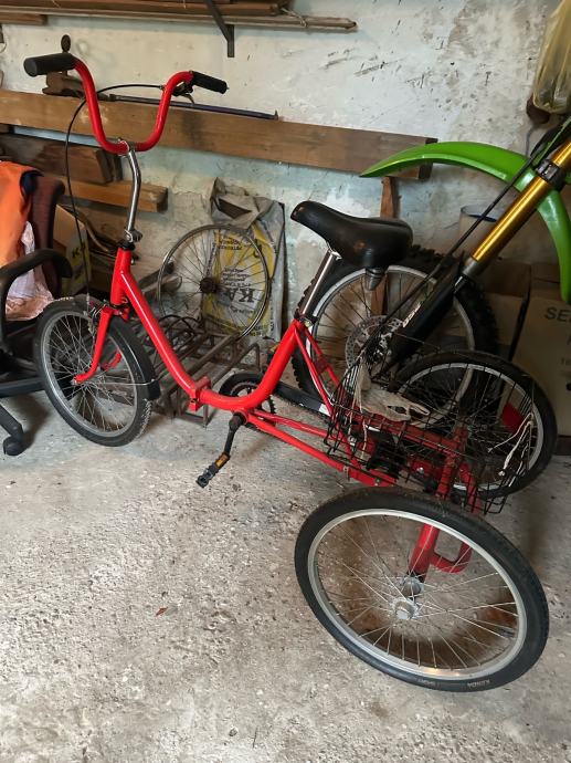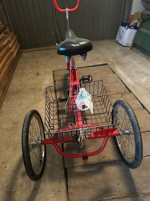 Prodajem rabljeni crveni tricikl s praktičnom košaricom za prijevoz stvari. Stabilan i udoban za vožnju s kvalitetnim sjedalom i čvrstim metalnim okvirom. Idealan za svakodnevnu uporabu ili za osobe kojima je potrebna dodatna stabilnost pri vožnji.