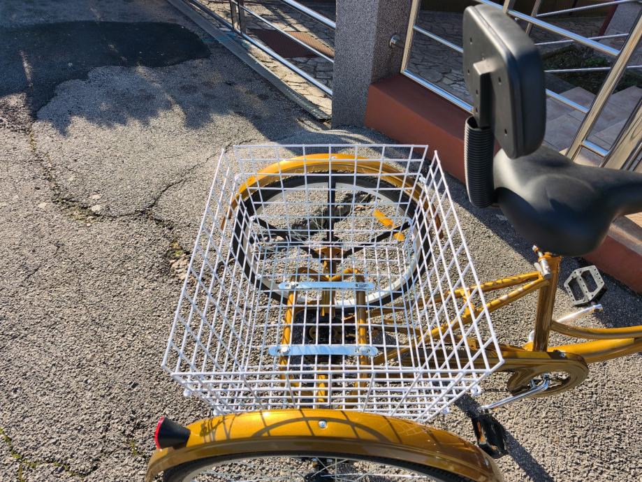 Kotači veličine 24", 6 brzina sa ispravnim stražnjim mjenjačem, prednja ručna, stražnja doboš kočnica. Udobno mekano sjedalo sa naslonjačem, praktična velika košara straga za prijevoz svega što vam je potrebno.